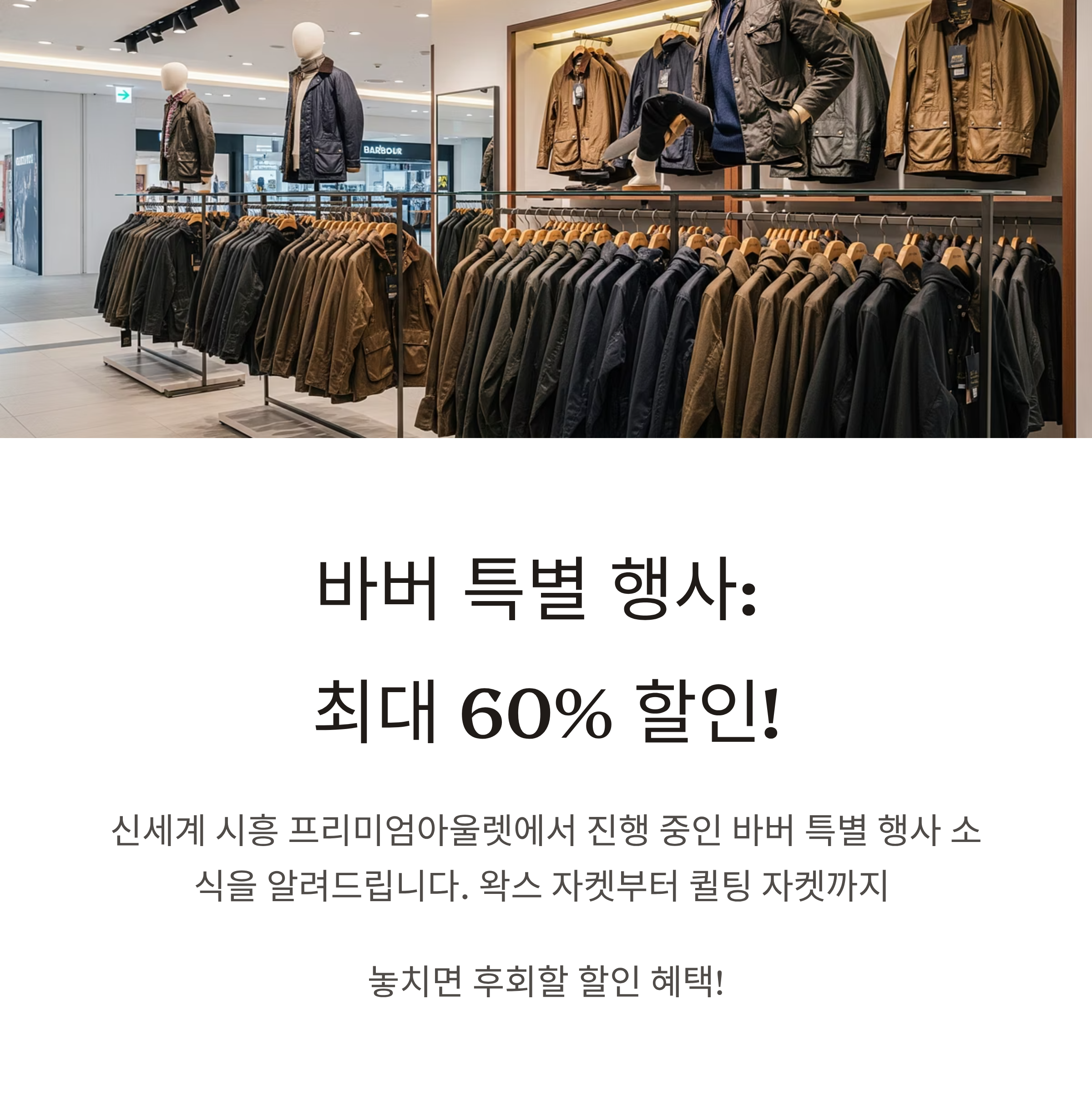신세계 시흥 프리미엄아울렛 바버(Barbour) 행사 방문기: 왁스 자켓부터 퀼팅 자켓까지, 시즌오프 할인율 총정리