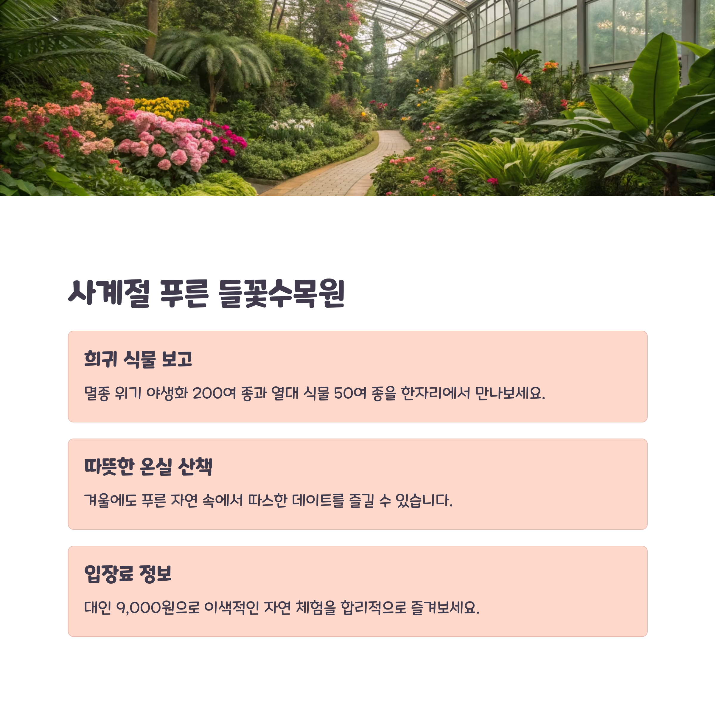 들꽃수목원은 계절을 느끼기 좋은 장소로 실내 열대 식물을 가까이서 관찰하며 힐링을 느낄 수 있습니다. 특히 추운 날씨엔 더욱 가치 있는 방문이 될 것입니다.