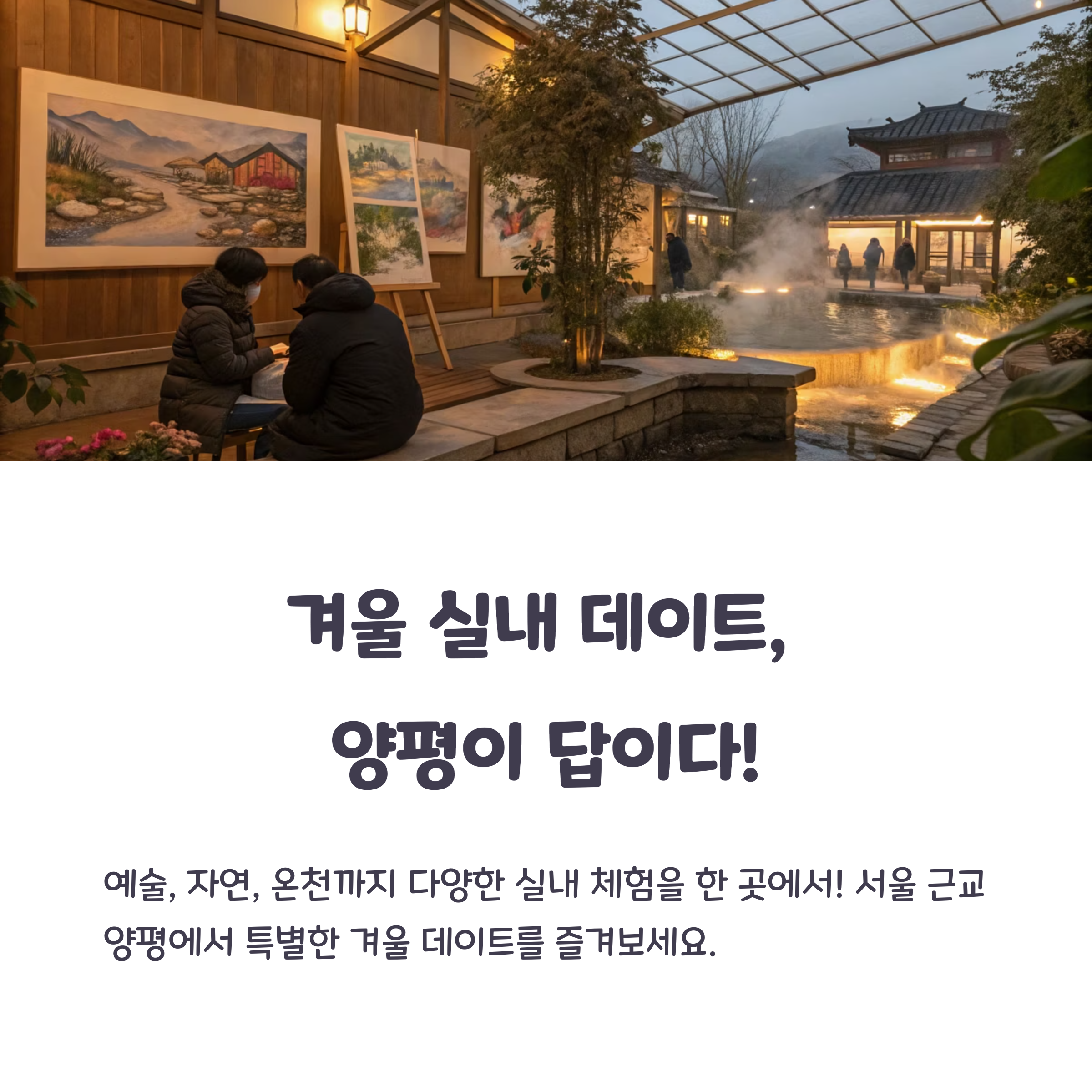 안녕하세요, 스마트트래블 유노이안입니다! 오늘은 데이트를 더욱 낭만적으로 만들어줄 경기도 양평의 실내 체험 코스를 소개해 드리려고 합니다. 추운 계절에도 따뜻하고 즐거운 하루를 만들어줄 다양한 공간들을 준비했으니 끝까지 읽어보세요!