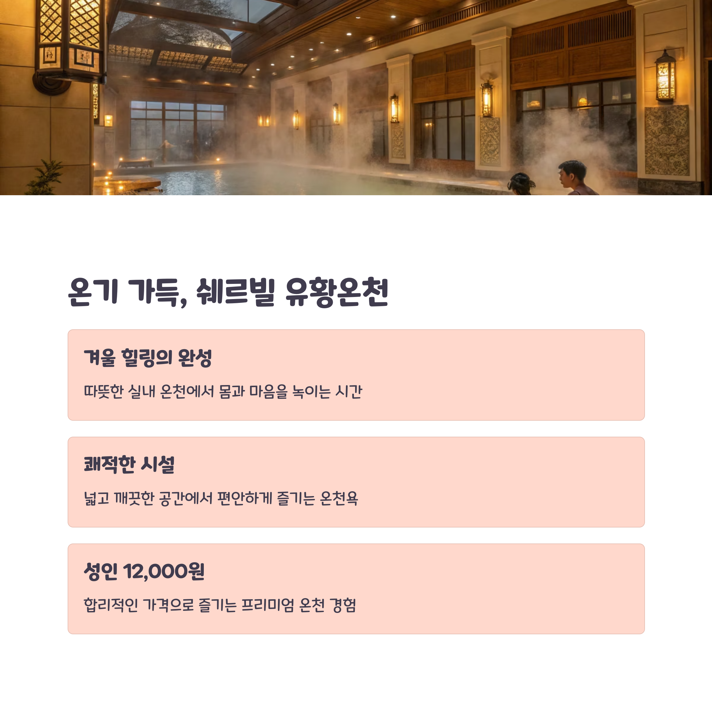 마지막 방문지로 쉐르빌 유황온천을 도입하면 하루 동안 쌓였던 피로를 풀며 실내 데이트를 마무리할 수 있습니다.