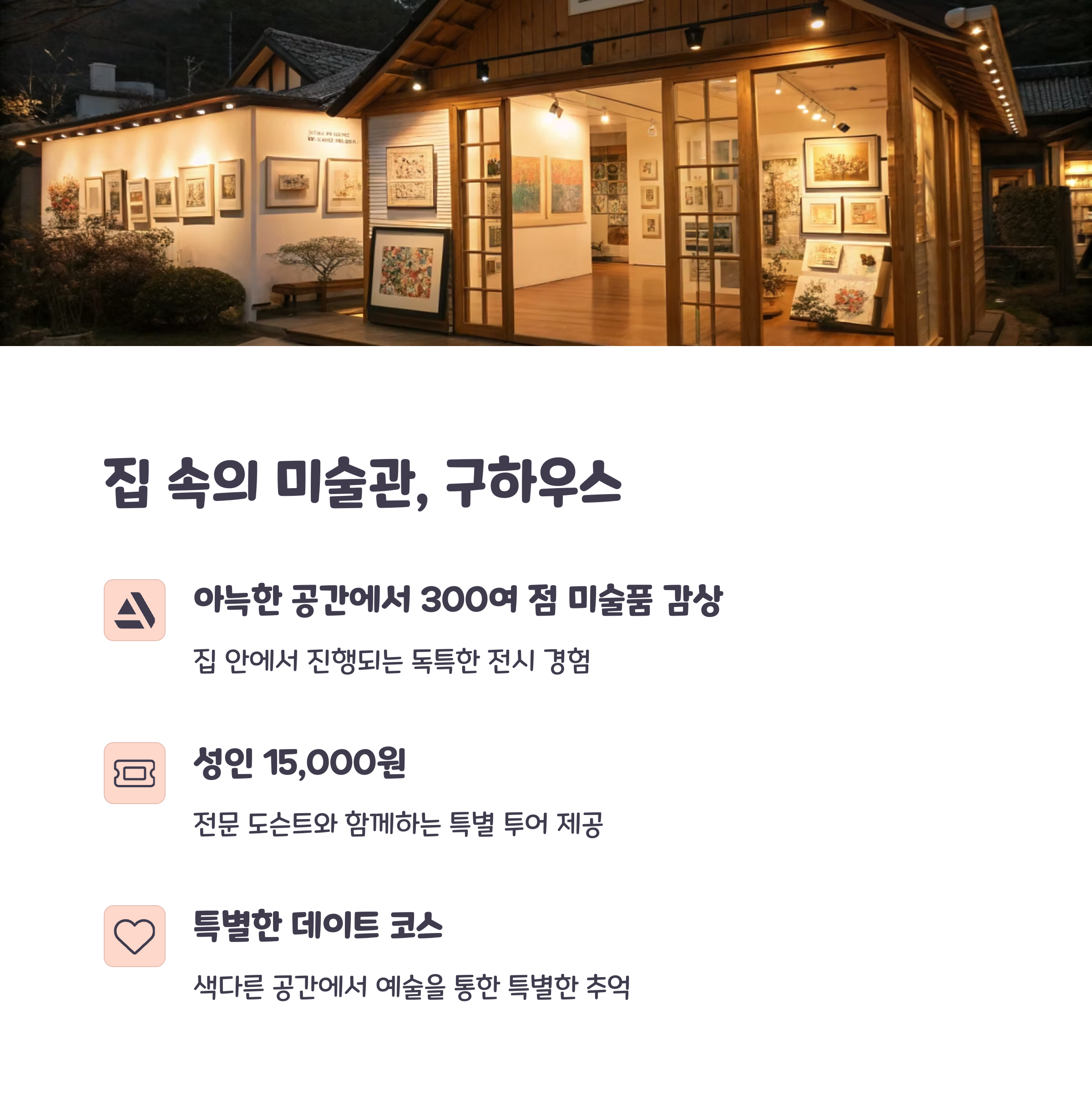 실내 데이트 코스에서 꼭 방문해야 할 첫 번째 장소는 구하우스 미술관입니다. 전통적인 미술관과 다르게 실제 생활 공간에서 예술 작품을 감상할 수 있는 독특함이 돋보입니다.