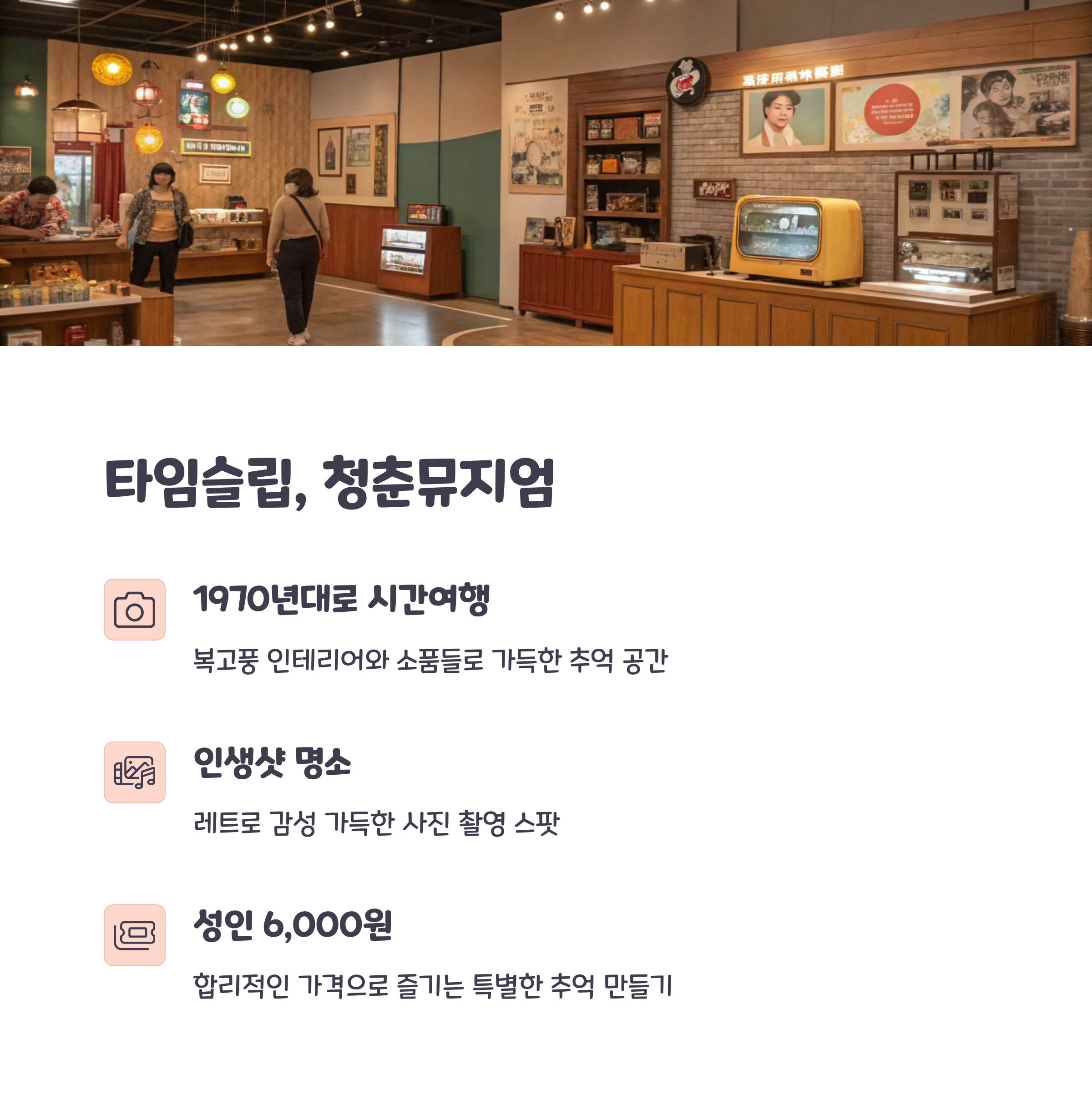 1970년대의 복고 감성을 체험할 수 있는 추억의 청춘뮤지엄은 친구나 연인, 가족 모두에게 추억을 선사할 특별한 공간입니다.