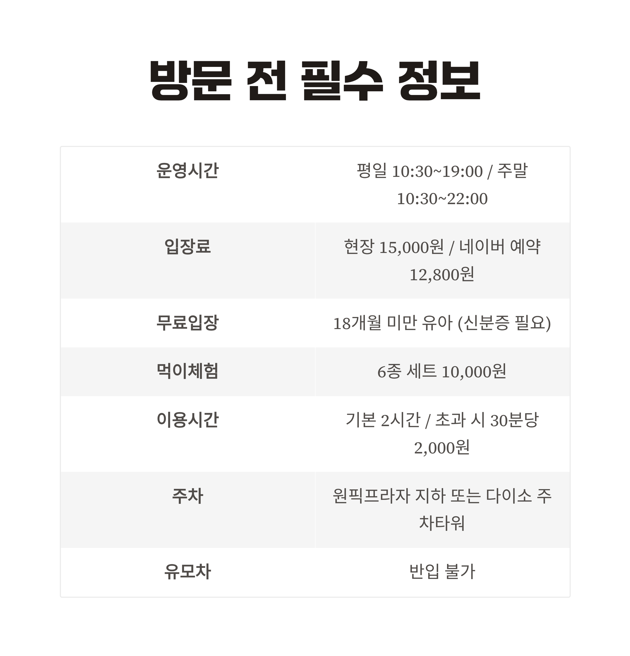 | 입장료 | 현장가 1인 15,000원 (어른·아이 동일) / 네이버 예약 시 약 12,800원 |