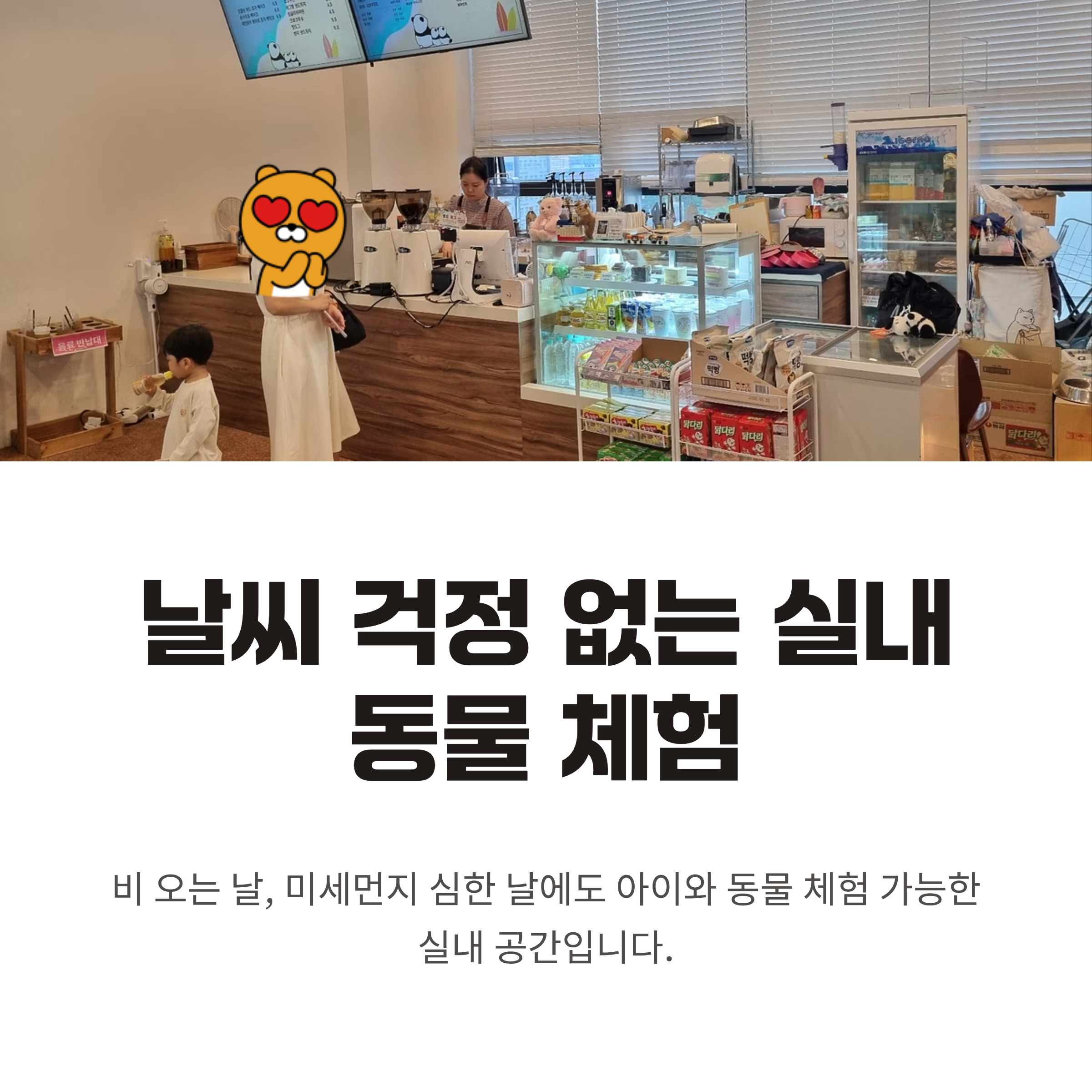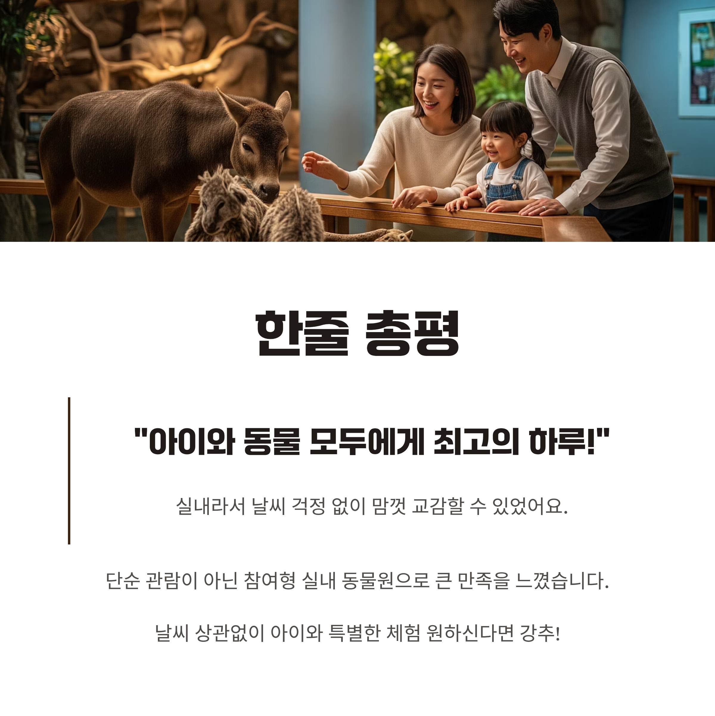 “아이와 동물 모두에게 최고의 하루! 실내라서 날씨 걱정 없이 맘껏 교감할 수 있었어요.”