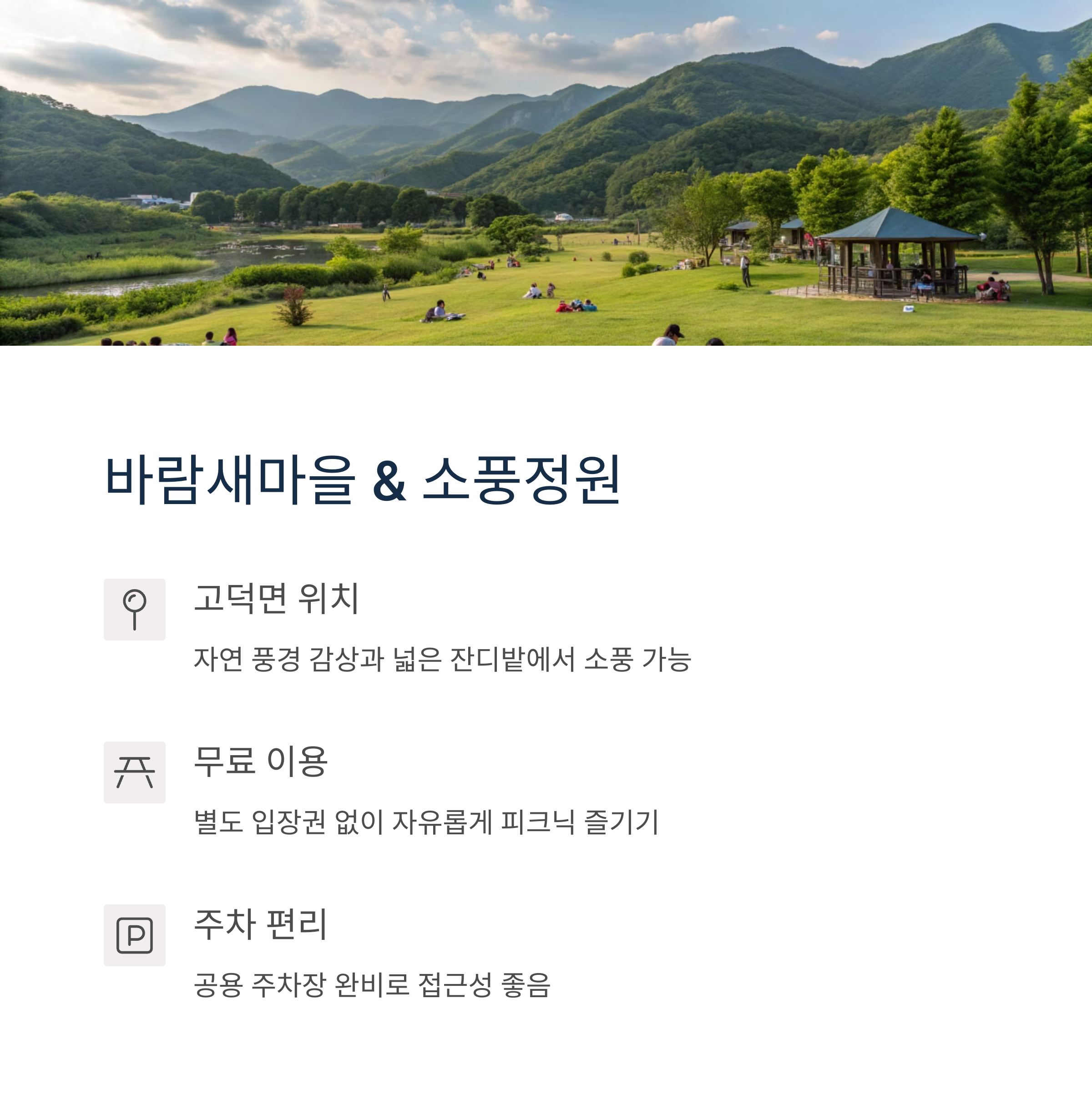 | 아이들이 자연과 함께 놀 수 있는 최고의 장소는 바람새마을 & 소풍 정원입니다. 넓은 잔디밭과 산책로가 있어 뛰어놀기에 적합합니다. 사계절의 다채로운 자연 풍경을 감상할 수 있습니다. 가족 단위 방문 시 편안하게 시간을 보낼 수 있습니다. 주차 편의 또한 우수하여 접근성에 문제가 없습니다. |