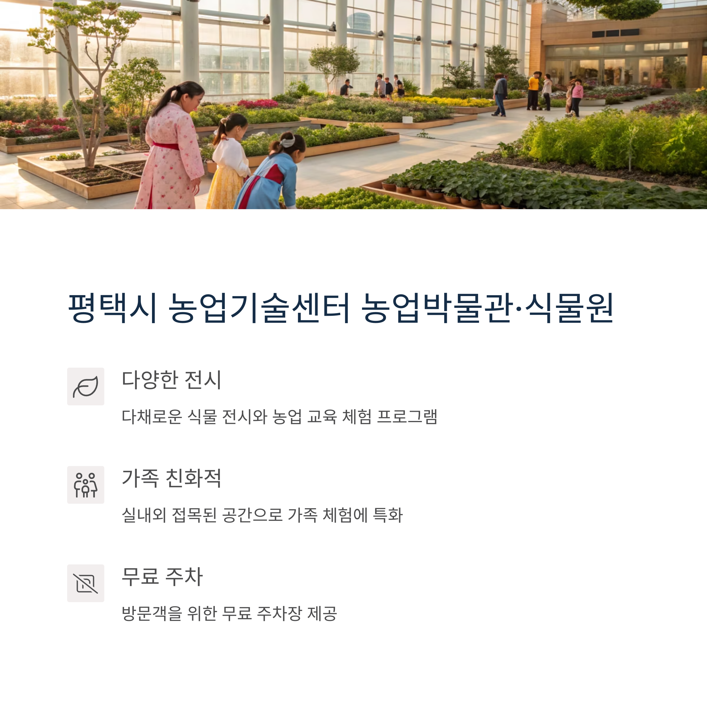 마지막으로 평택시 농업기술센터의 대형 식물원은 아이들이 자연과 농업에 대한 호기심을 키울 수 있는 완벽한 장소입니다.