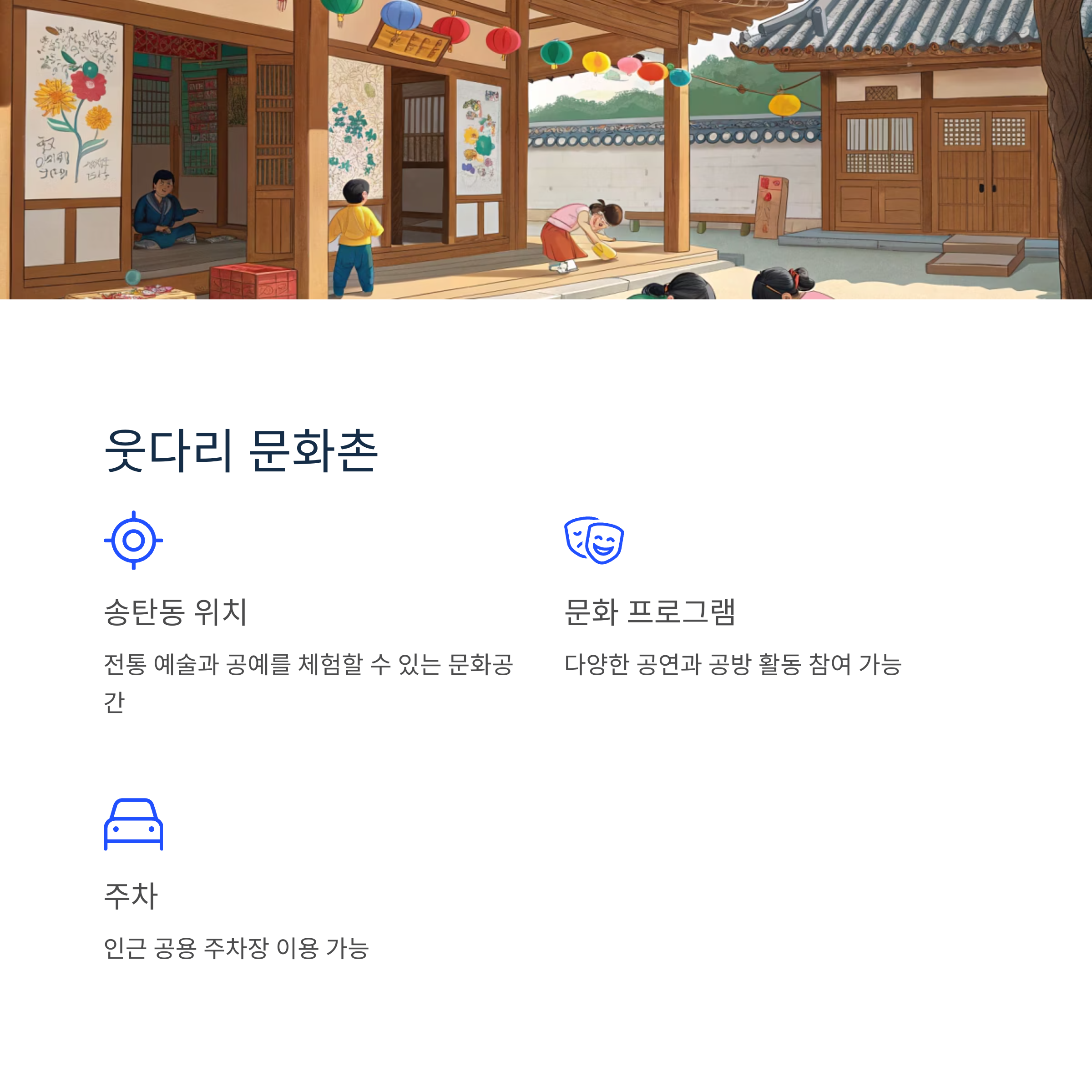 웃다리 문화촌에서는 아이들과 함께 전통 문화를 체험하고, 창의적인 예술 활동을 경험할 수 있어 특별한 시간을 보낼 수 있습니다.