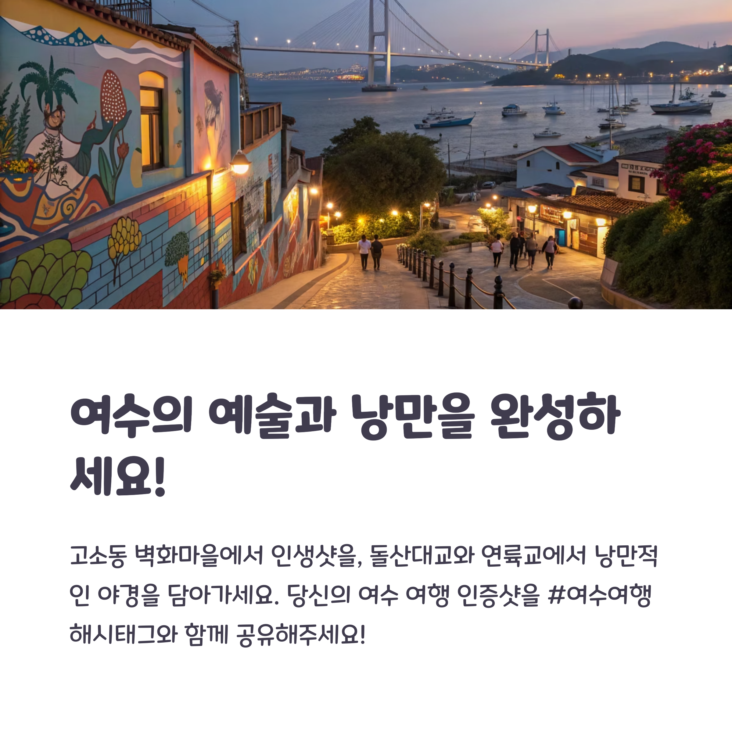 이 외에도 고소동 벽화마을, 돌산대교 등은 여수의 예술적 감각과 도시의 매력을 동시에 느낄 수 있는 공간입니다.