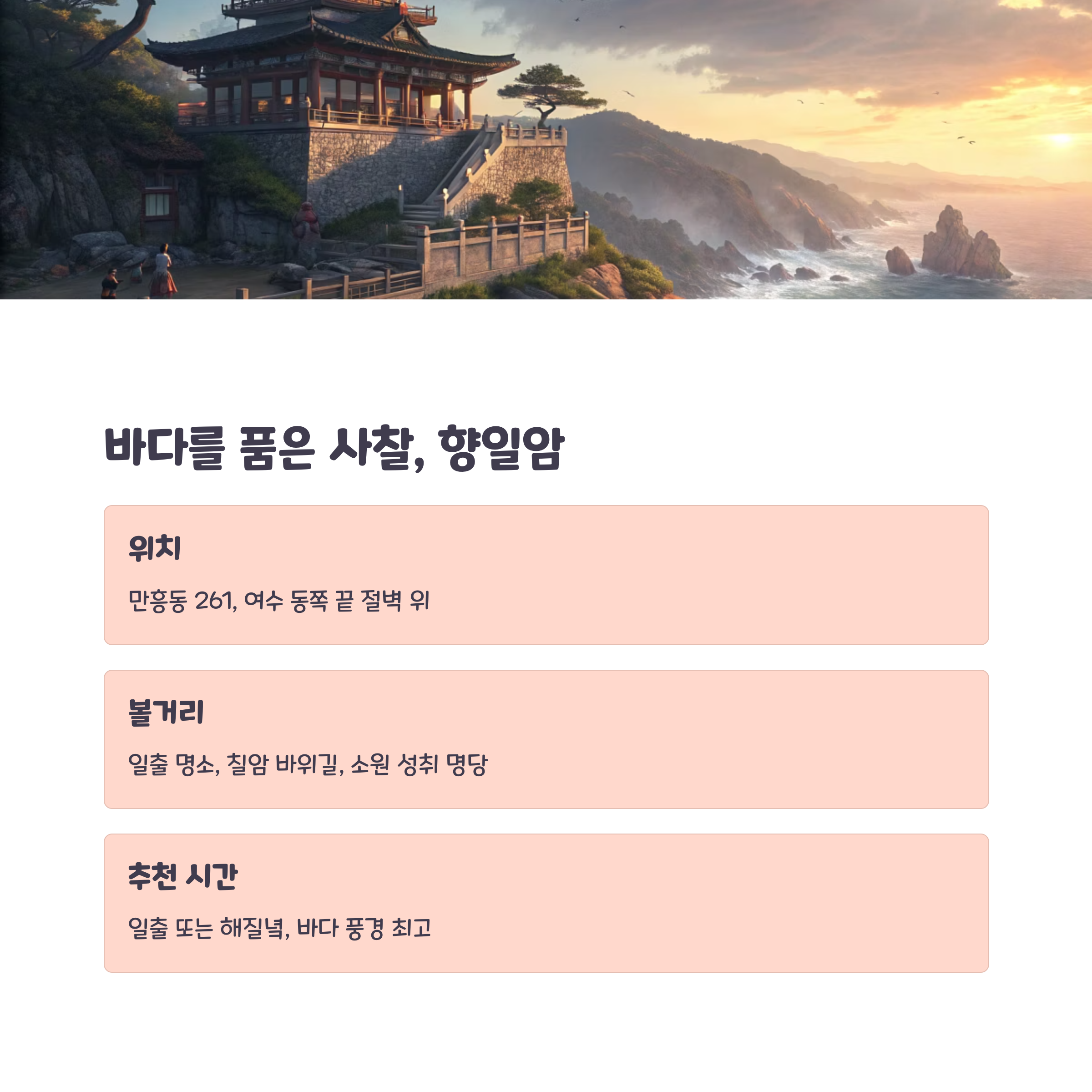 또한 오동도와 향일암은 여수의 자연과 역사를 이해할 수 있는 명소로, 사진 촬영 및 산책 코스로도 인기 있습니다.