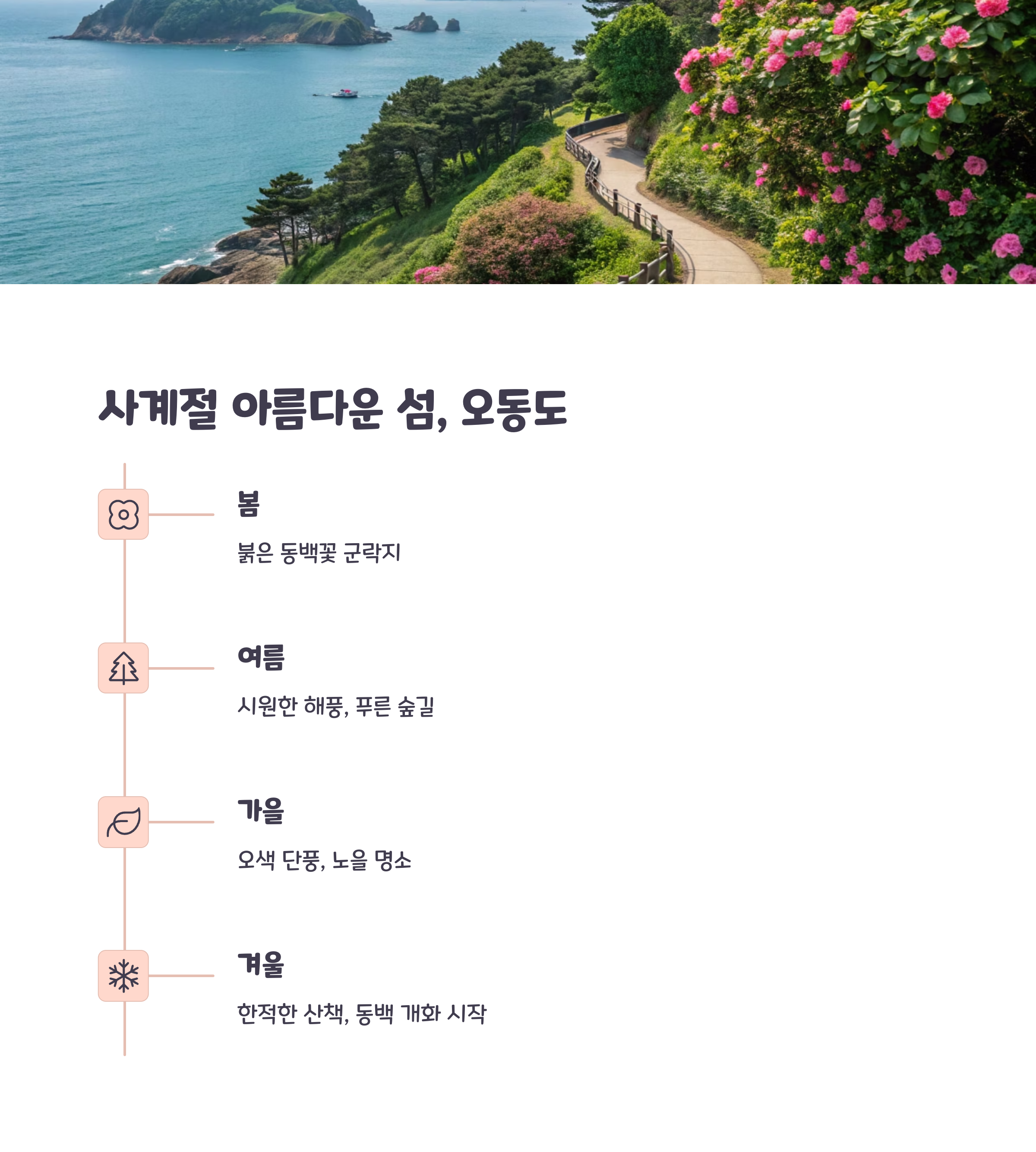 여수 여행의 즐거움은 계절에 따라 다양한 특별함을 제공합니다. 봄에는 오동도의 동백꽃과 함께 산책을 즐길 수 있습니다.