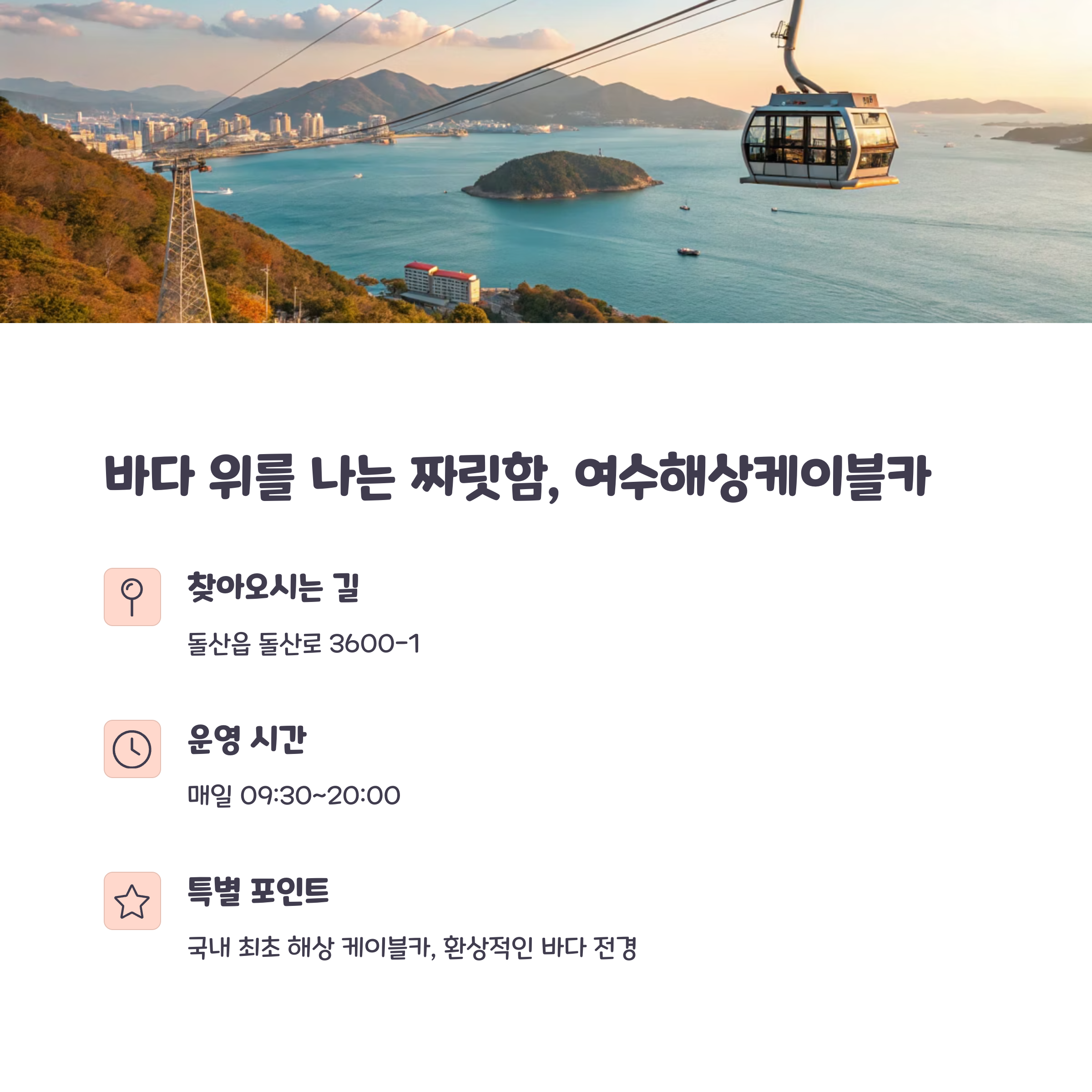 | 여수해상케이블카 | 09:30 - 20:00 | 13,000원 |