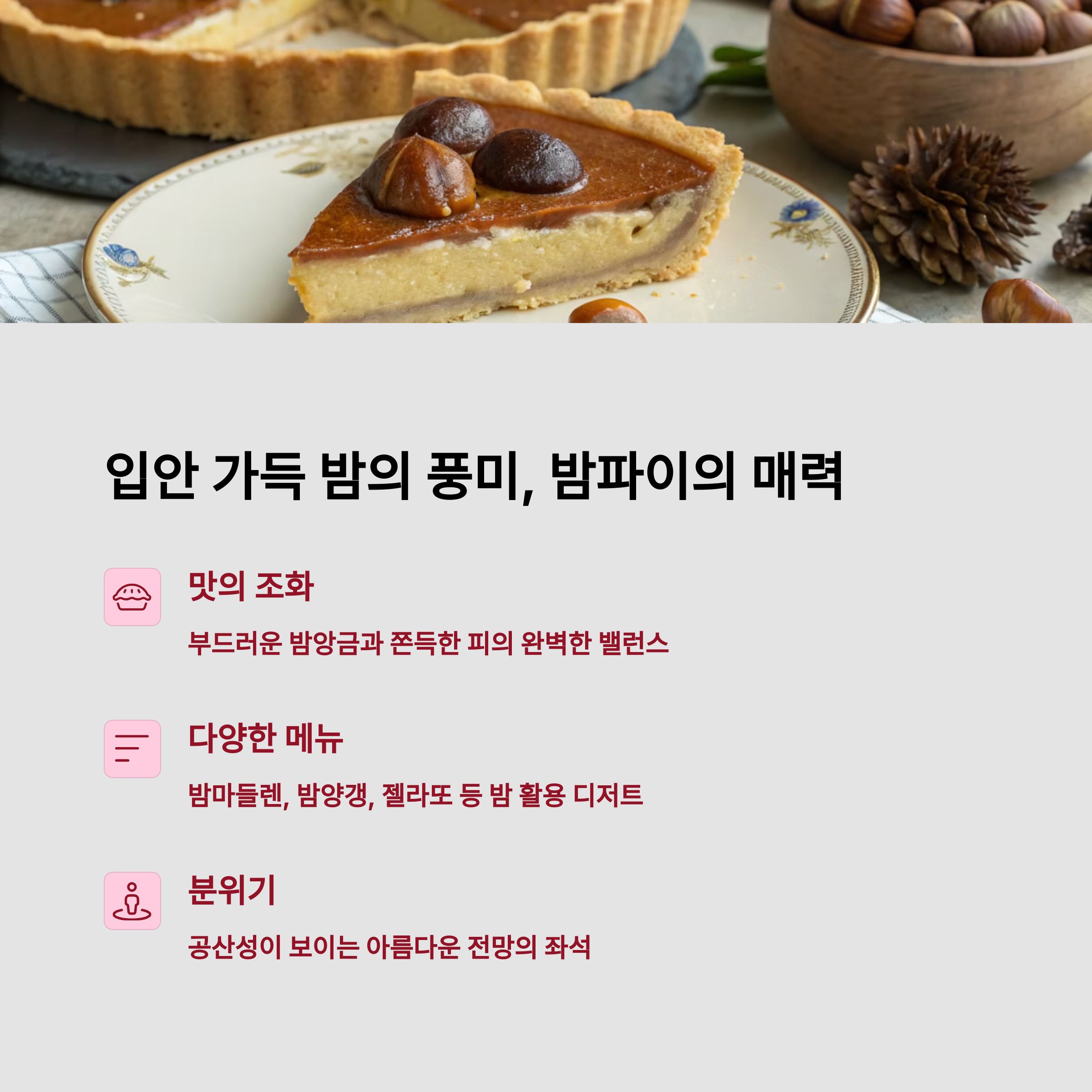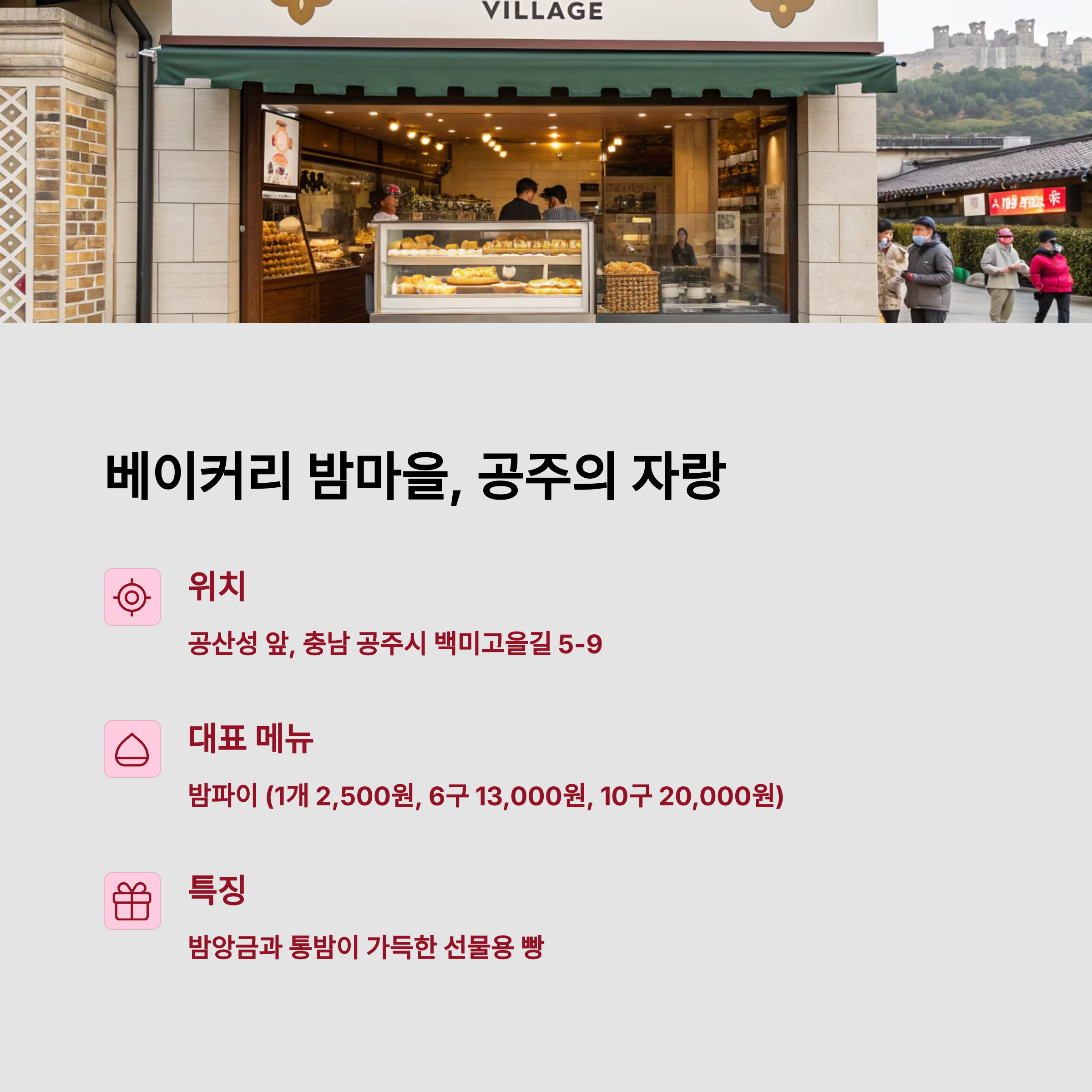 | 베이커리 밤마을 | 밤파이 | 2,500원(낱개) | 공주 밤 활용 |