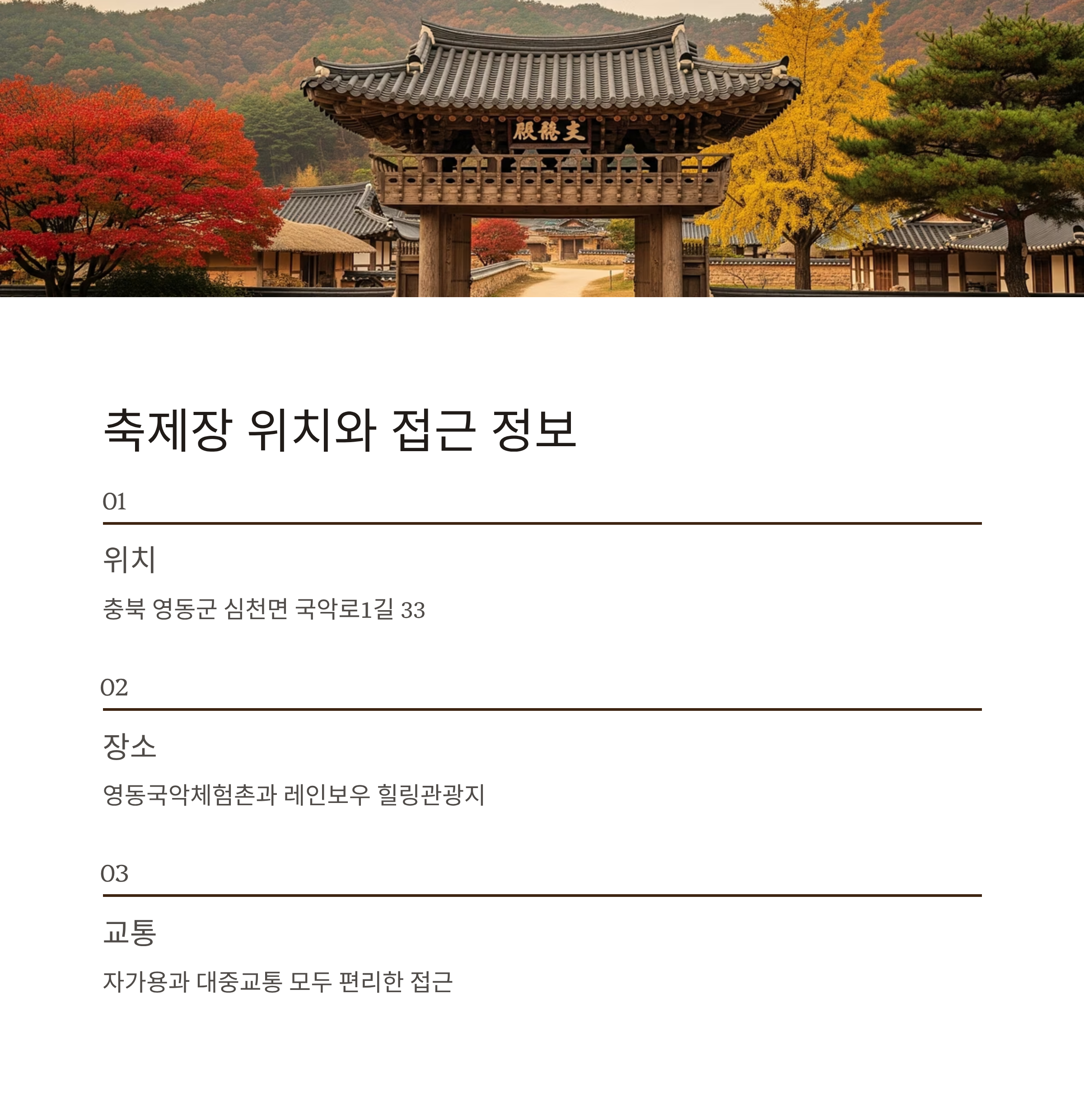 | 장소 | 충북 영동군 심천면 국악로1길 33 (영동국악체험촌 외) |