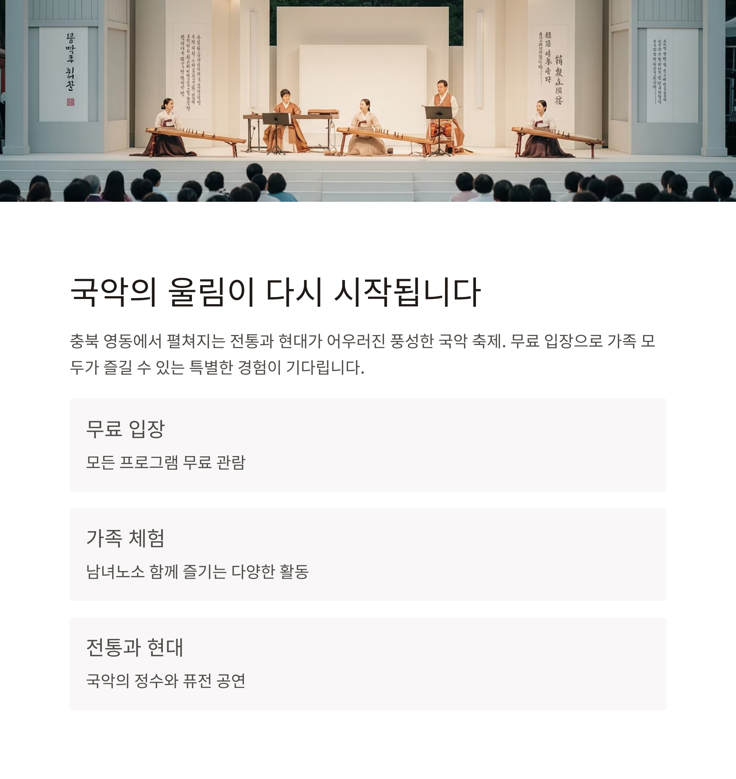 | 프로그램 | 국악 공연, 체험, 전시, 퍼포먼스, 연계 축제 등 |