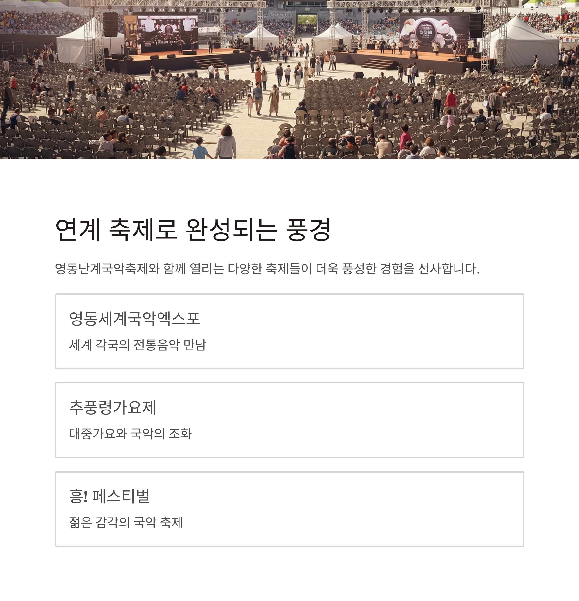 | 프로그램 | 국악 공연, 체험, 전시, 퍼포먼스, 연계 축제 등 |