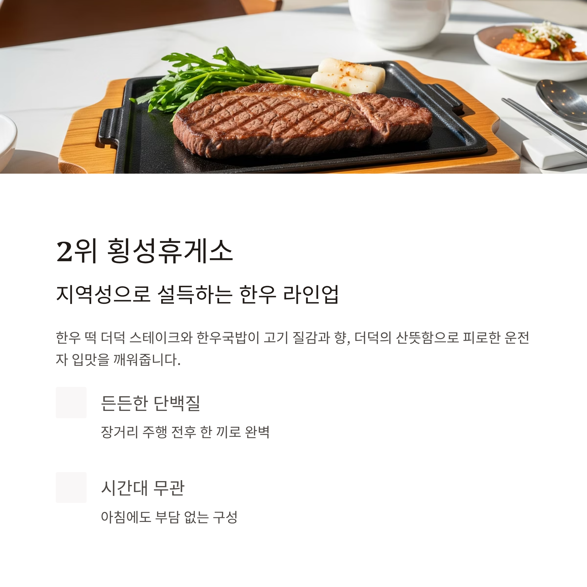 횡성은 말 그대로 지역의 힘입니다. 한우 떡 더덕 스테이크와 한우국밥은 고기 질감과 향, 더덕의 산뜻함으로 피로한 운전자 입맛을 확 깨워줍니다. 든든한 단백질 기반이라 장거리 주행 전후 한 끼로 알맞고, 아침 시간대에도 무리 없는 구성이어서 시간 대비 만족이 높습니다. 방송·공공 리스트 언급도 잦아 신뢰도가 탄탄합니다.