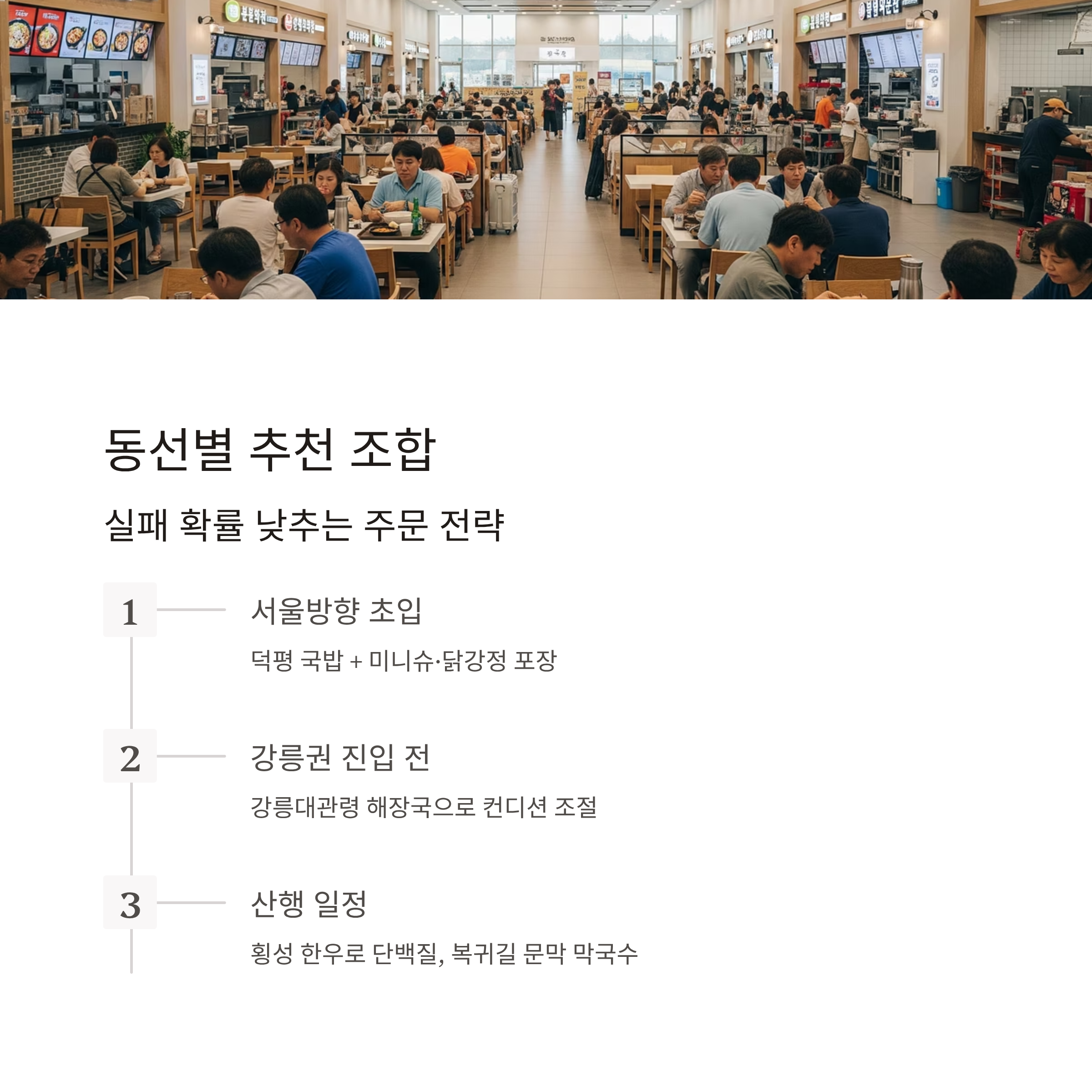 서울방향 장거리 초입이라면 덕평 국밥으로 속을 데우고, 간식은 미니슈·닭강정을 포장해 가세요. 강릉권 진입 전이라면 강릉대관령 해장국으로 부담 없이 컨디션을 맞추는 편이 좋습니다. 산행·트레킹 일정이면 횡성 한우 라인업으로 단백질 채우고, 복귀길엔 문막 막국수로 가볍게 정리하는 식의 왕복 플랜이 깔끔합니다. 선택은 단순할수록 만족이 오래갑니다.
