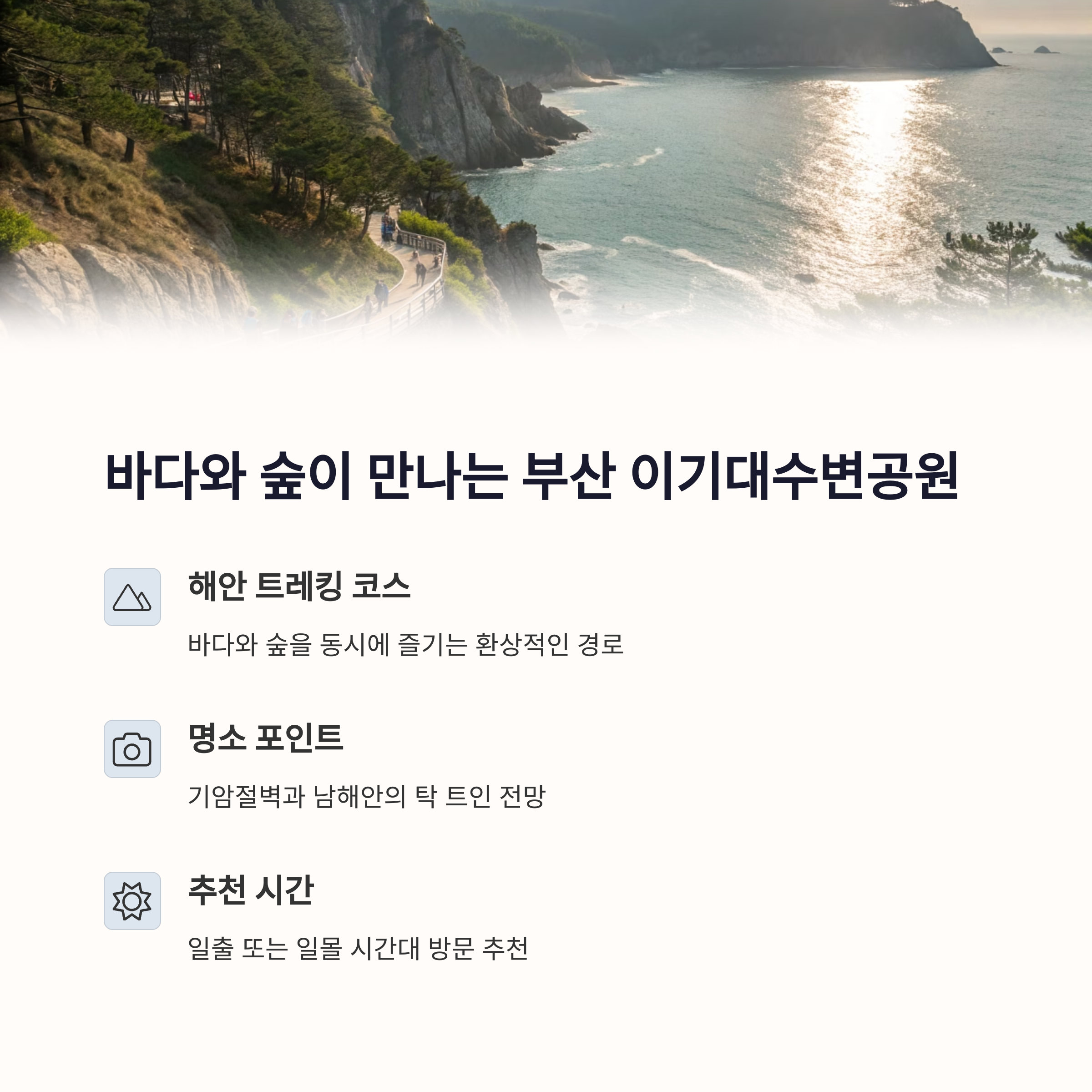 첫 번째 추천지는 부산의 이기대수변공원입니다. 이곳은 숲과 바다 풍경을 한꺼번에 즐길 수 있는 트레킹 명소로, 2시간 정도의 코스가 마련되어 있습니다. 부산역에서 접근하기도 쉽고 자연과 도심 경계에 위치해 있어 힐링하기에 딱 좋습니다.
