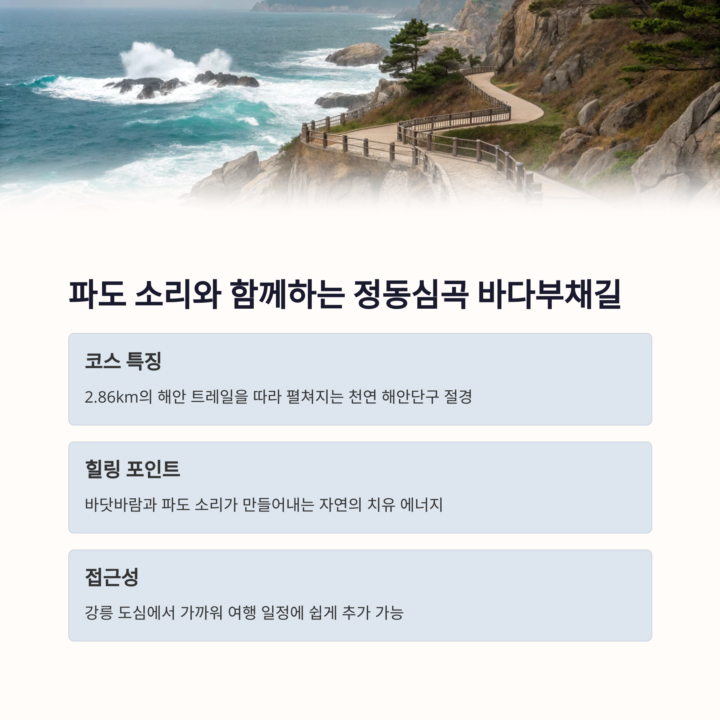 두 번째 장소는 강릉의 정동심곡 바다부채길인데요. 약 3.2km의 데크길은 멋진 바다 풍경 속에서 산책을 즐길 수 있게 설계되었습니다. 특히 파도 소리를 들으며 걷는 경험은 그야말로 낭만적입니다.