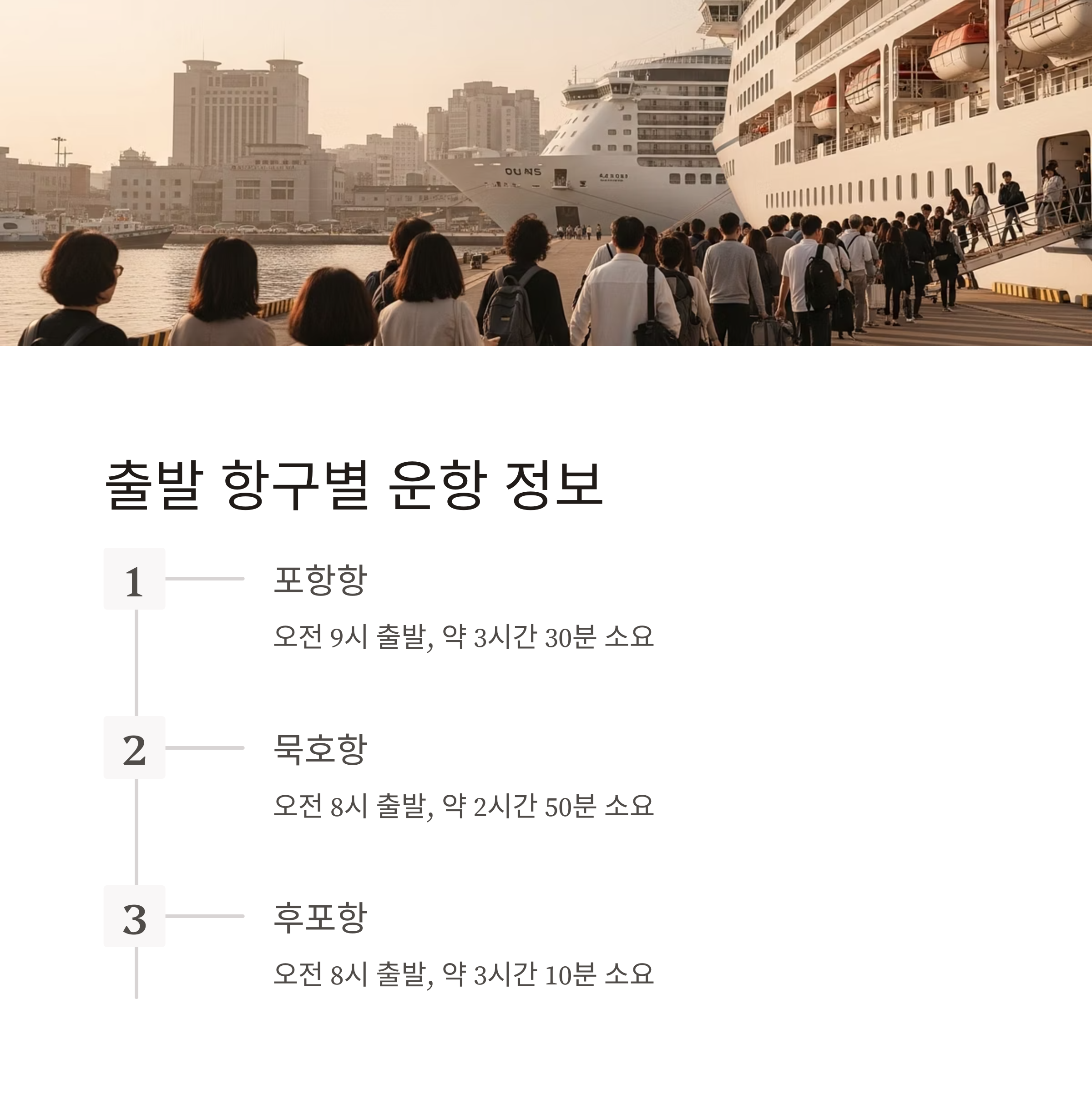 포항, 묵호(동해), 후포가 대표적이며 각 항구마다 운항 스케줄과 소요 시간이 다릅니다.