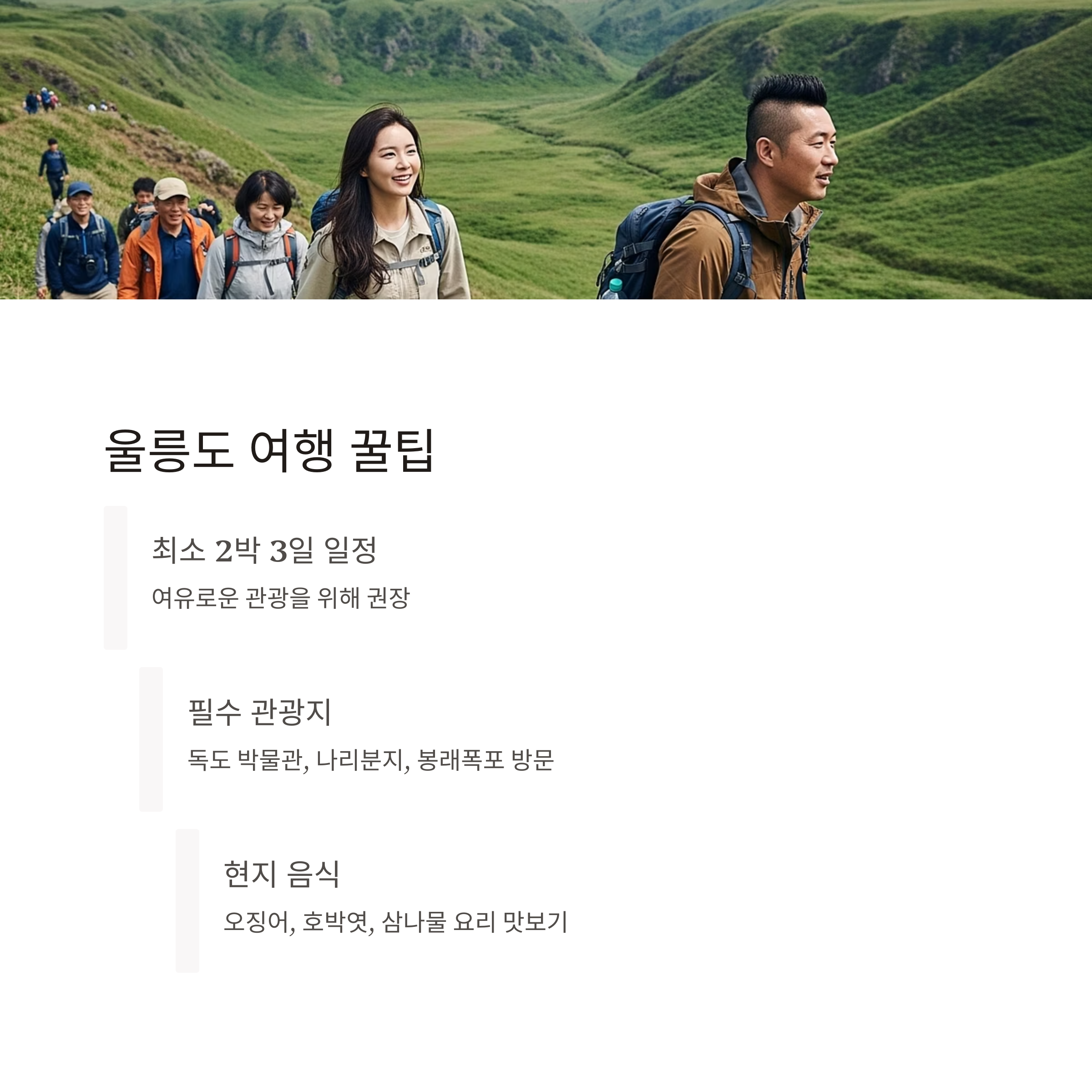 도동항 근처의 독도 박물관, 나리분지 트래킹, 봉래폭포, 해안도로 드라이브 등