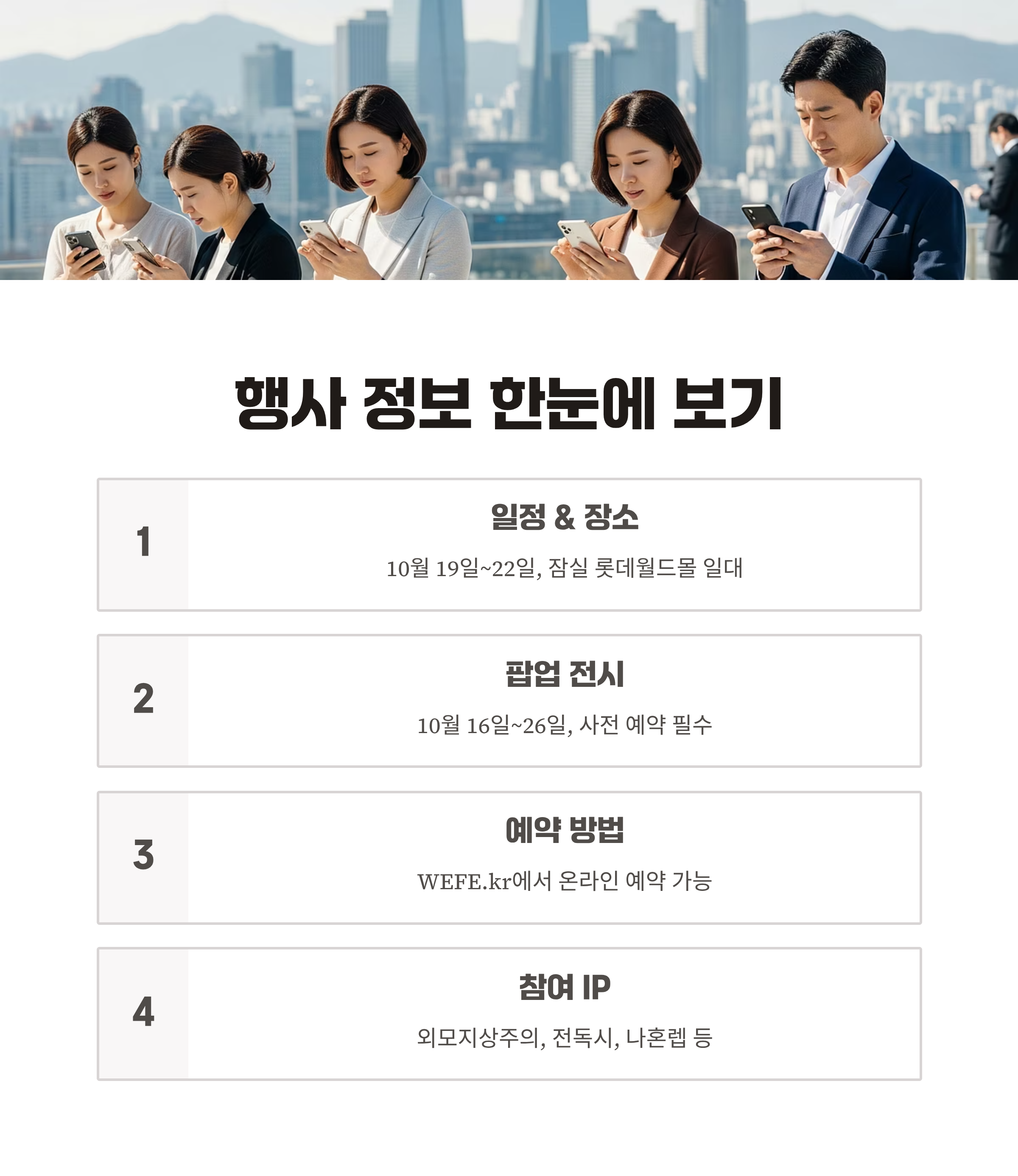 2025 WEFE는 단순한 전시가 아니라 웹툰 IP 전시, 작가 토크쇼, 애니 상영, 라이브 더빙쇼, 어워즈까지 총망라된 콘텐츠 페스티벌입니다. 특히 사전 예약제가 적용되는 팝업도 있으니 미리 체크는 필수예요.