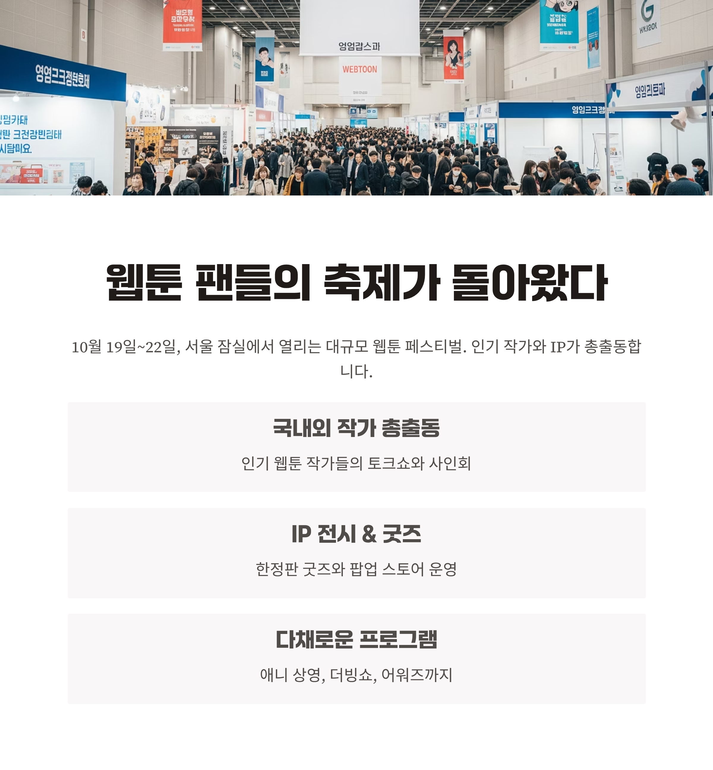 | 프로그램 구성 | 기획 전시, 작가 토크, 무대 이벤트, 더빙쇼, 애니 상영, 독자 참여 이벤트, 웹툰 어워즈 등 다양 |