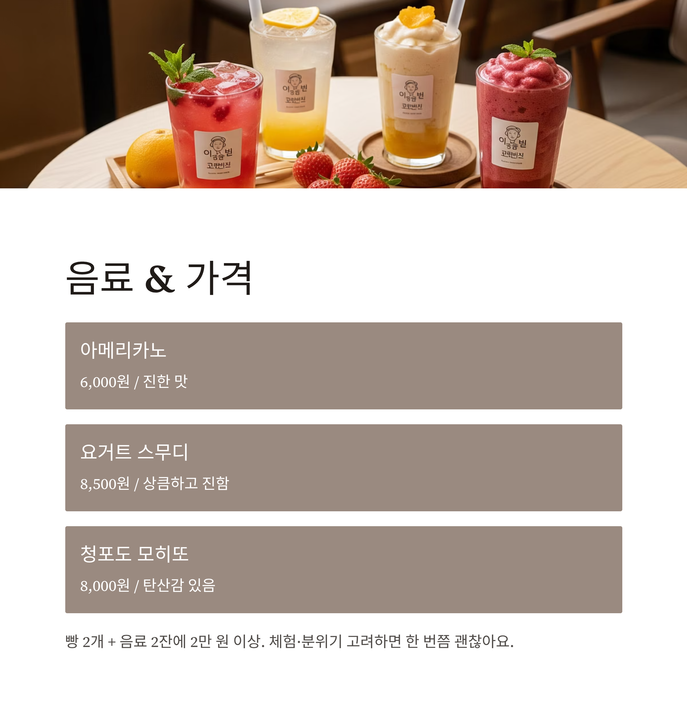 | 블루베리 요거트스무디 | 8,500원 | 상큼하고 진함, 어린이 입맛 추천 |