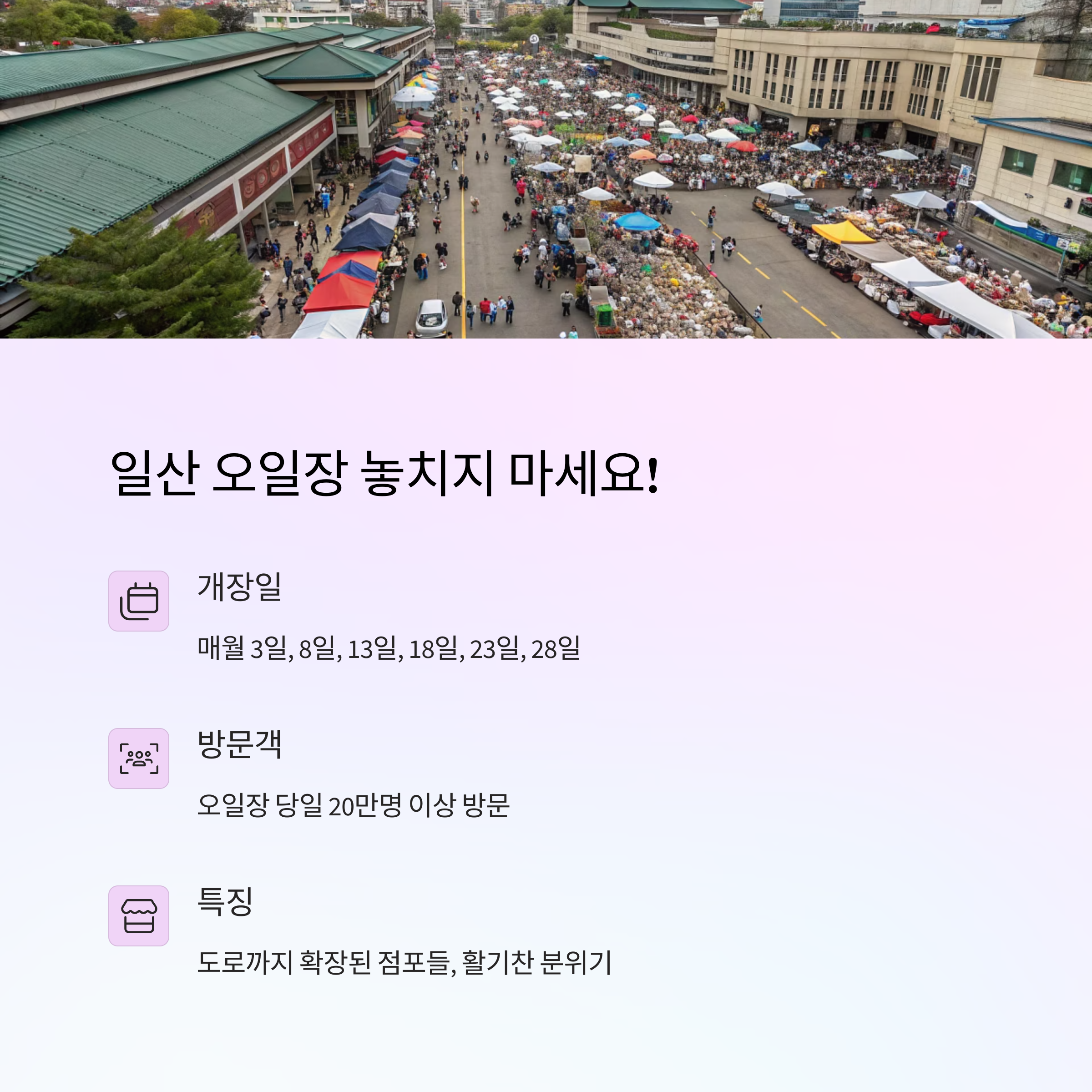 일산 오일장은 매달 3일과 8일 열리며, 다양한 전통 먹거리와 활기찬 분위기를 제공합니다.