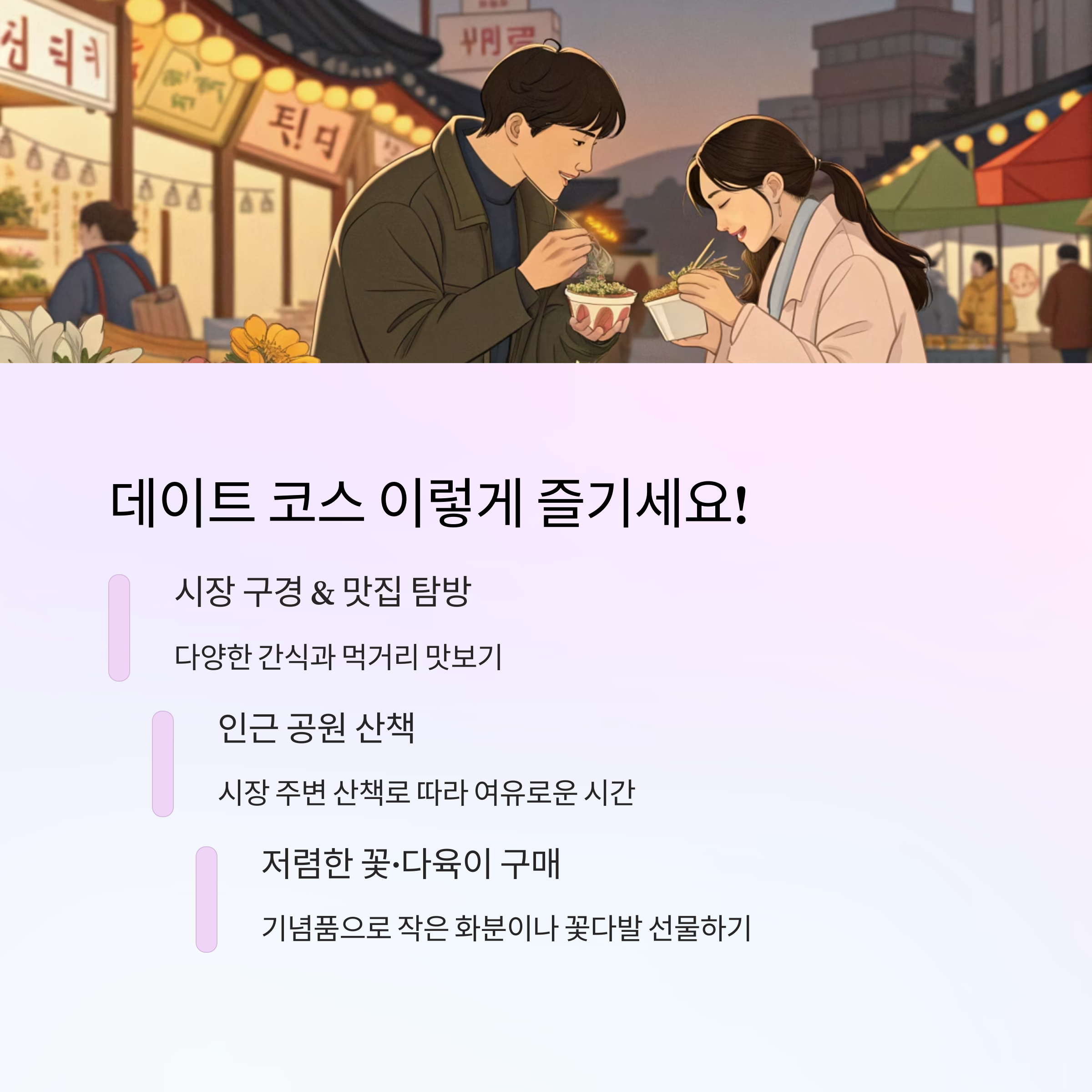 시장 탐방 후 근처 공원이나 맛집 코스를 더하면 하루가 더욱 알차게 완성됩니다.