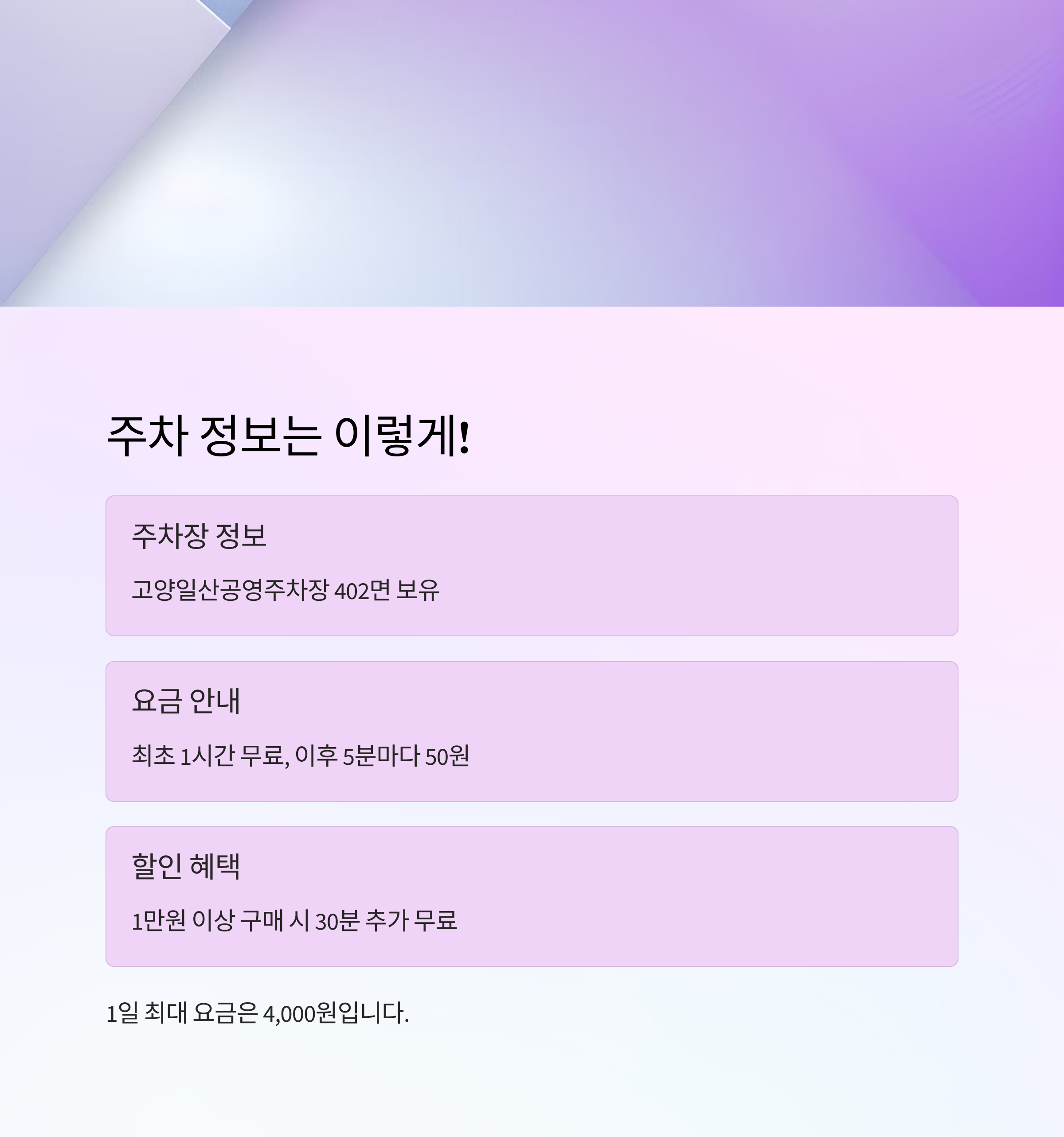 | 주차 정보 | 최대 1시간 무료, 이후 5분당 50원 |