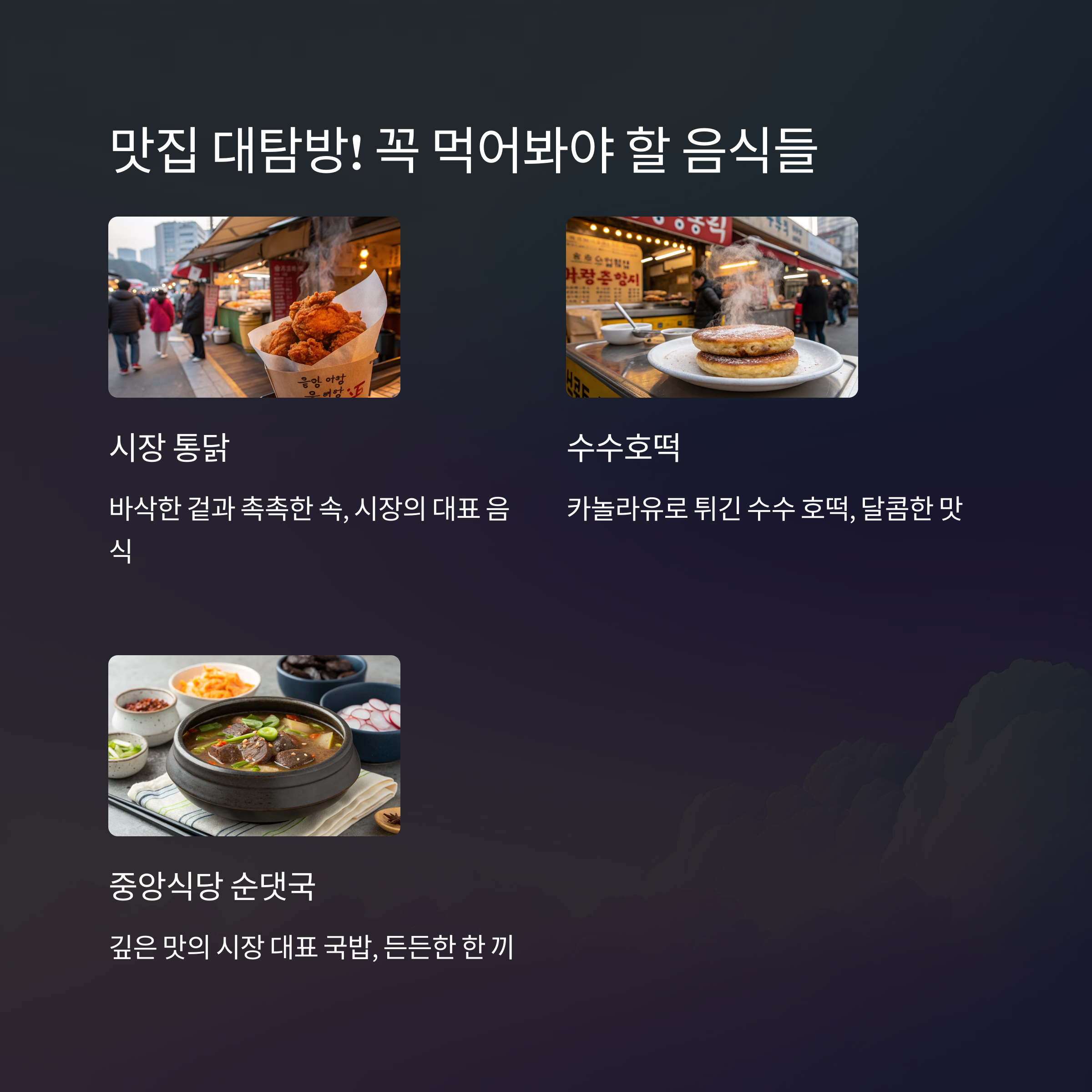 방문 시 필수로 챙겨야 할 수수호떡, 즉석 어묵 등 인기 메뉴부터 시장 밖 맛집까지 완벽한 코스를 즐길 수 있습니다.