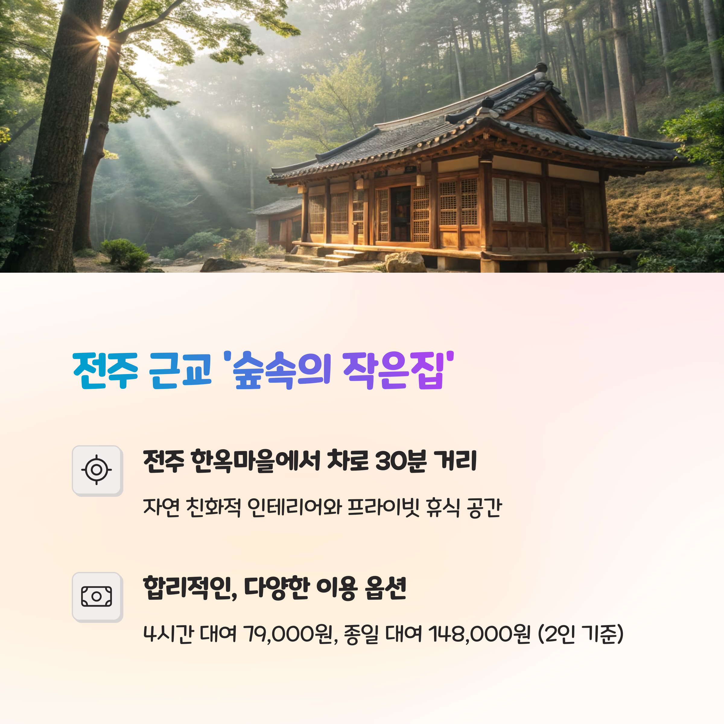 | 숲속의 작은집 | 전주 인근 | 79,000원부터 | 불멍 서비스 |