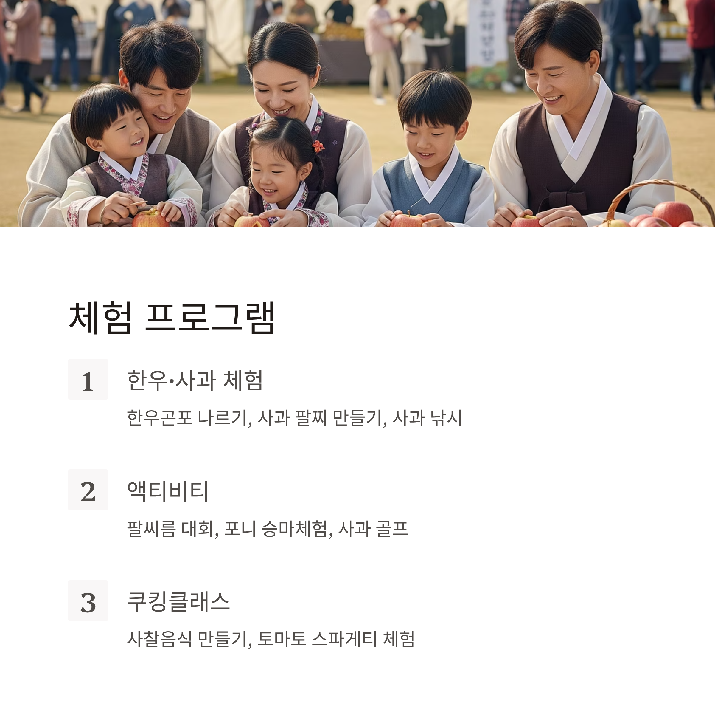 | 체험 콘텐츠 | 사과 팔찌 만들기, 한우곤포 나르기, 팔씨름 대회, 포니 승마체험 등 |