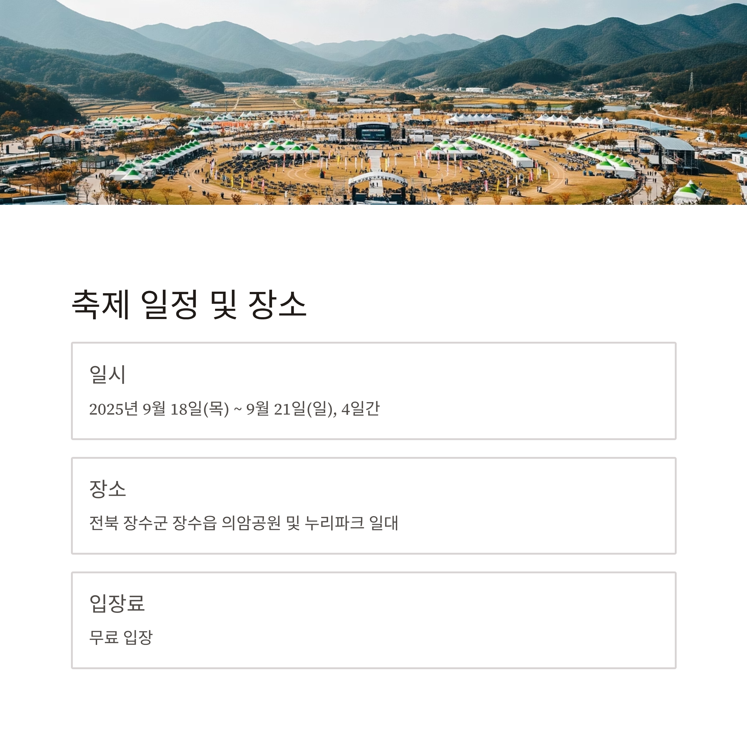 | 문의 및 안내 | 장수군청 관광산업과 / 축제 공식 홈페이지에서 업데이트 예정 |