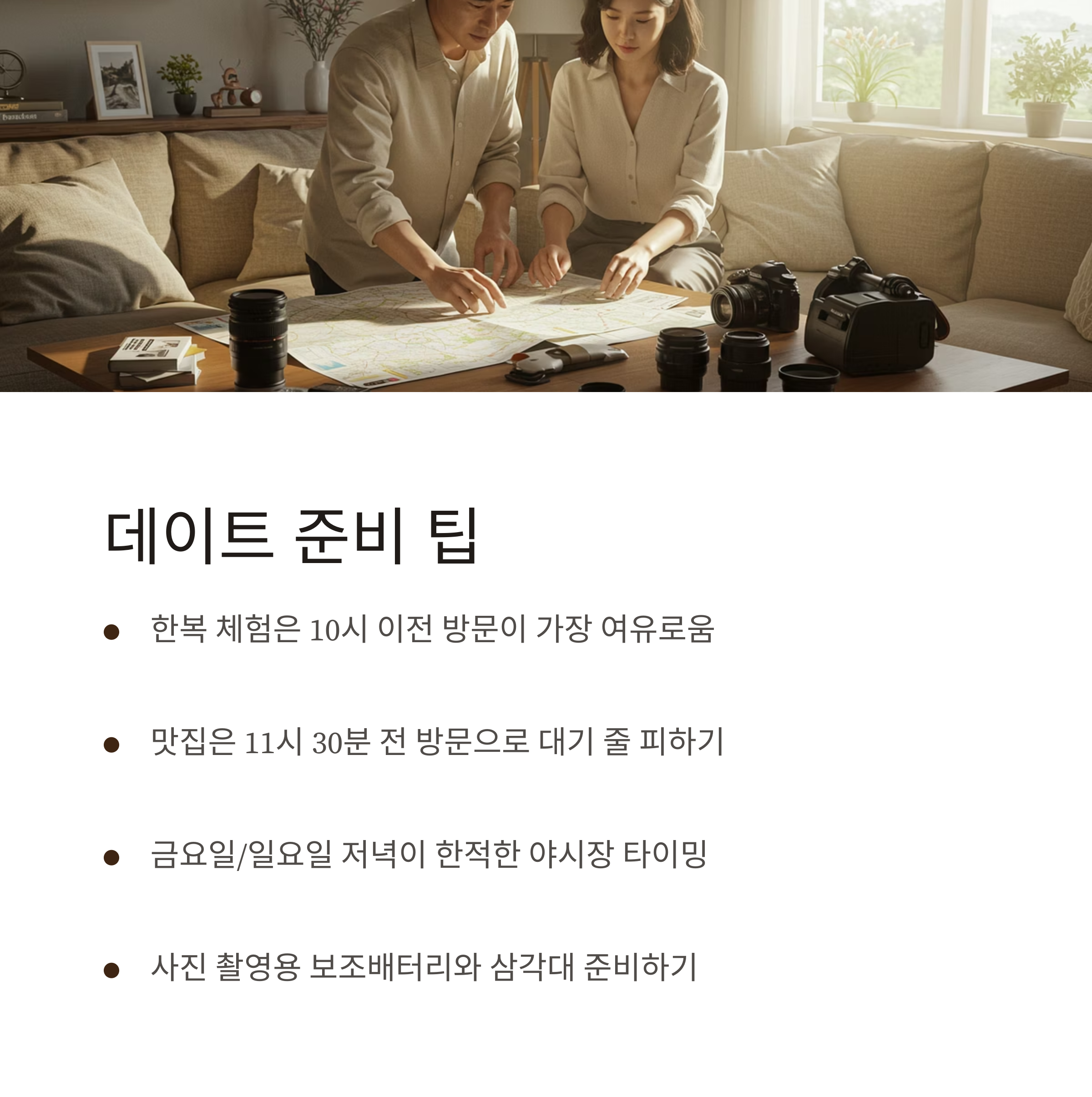 - 사진 촬영용 보조배터리와 삼각대 준비하면 인생샷 확률 상승