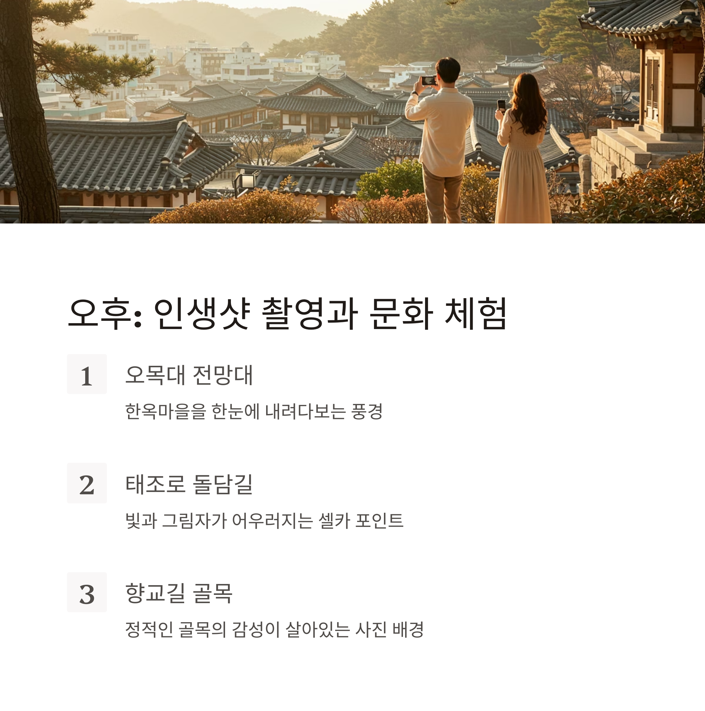 | 오후 | 포토존(오목대, 돌담길) + 전통 체험 | 사진 + 문화 콘텐츠 |