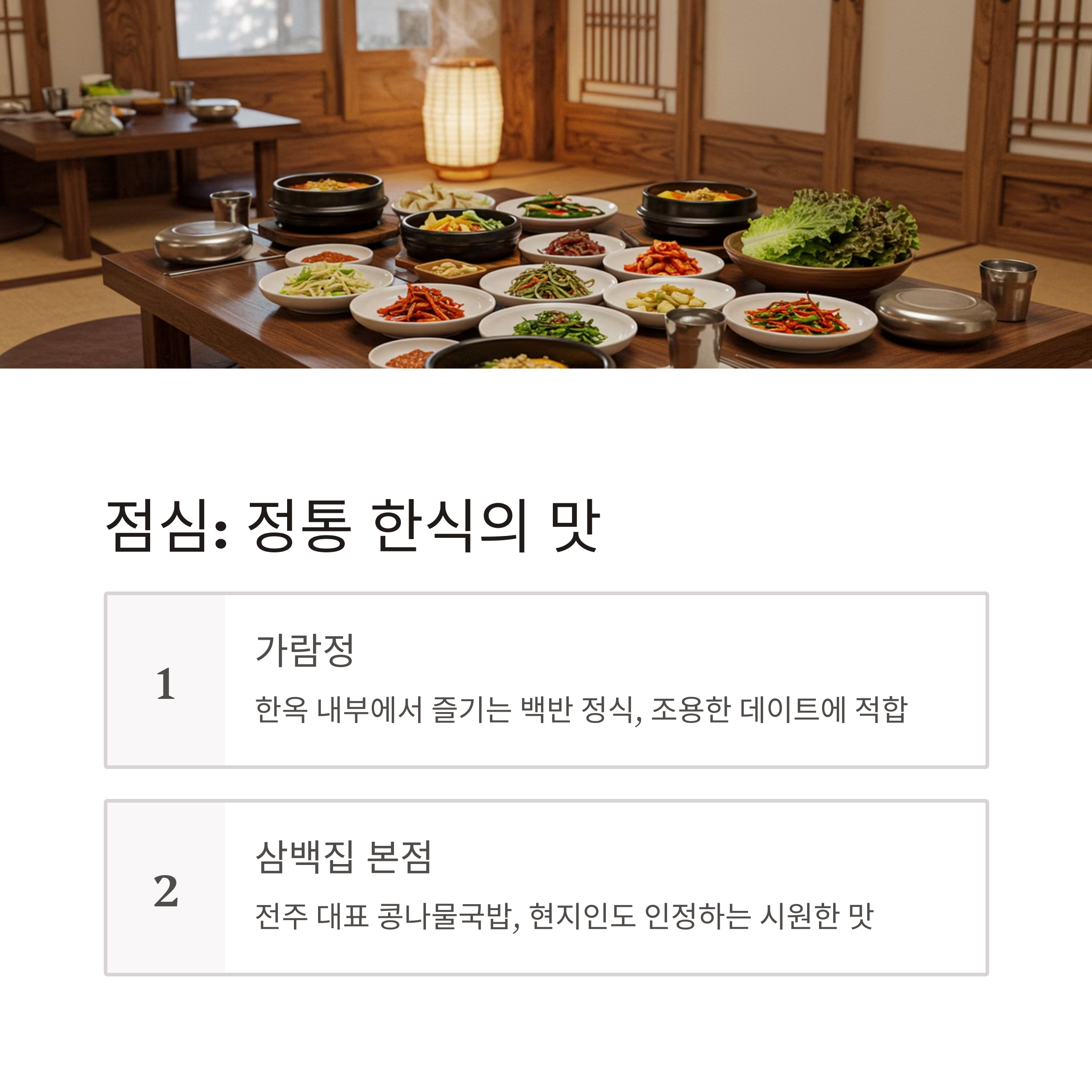 | 점심 | 가람정 or 삼백집 | 정갈한 전주 한식 체험 |