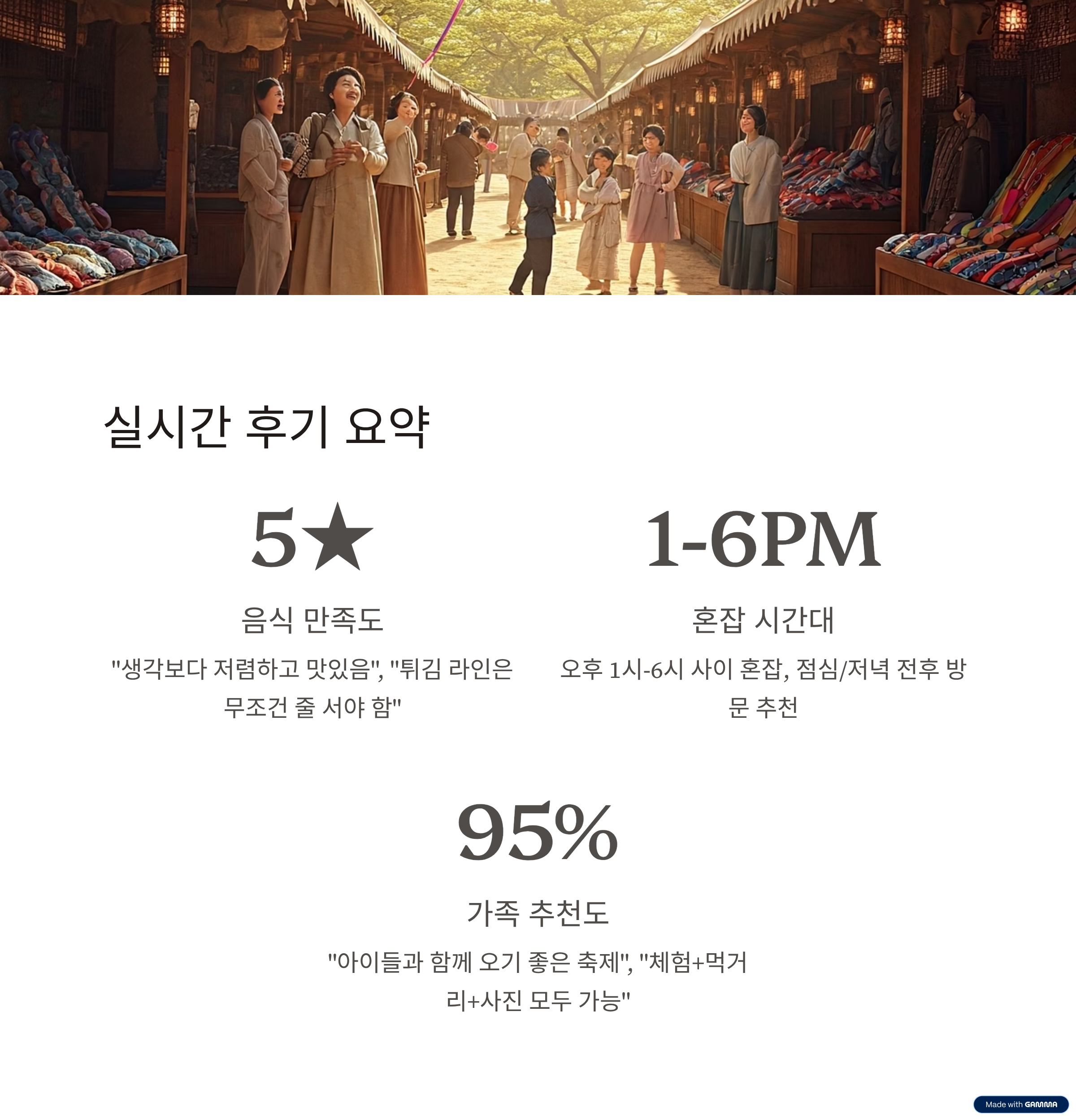 | 가족 방문 추천 여부 | "아이들과 함께 오기 좋은 축제", "체험+먹거리+사진 모두 가능" |