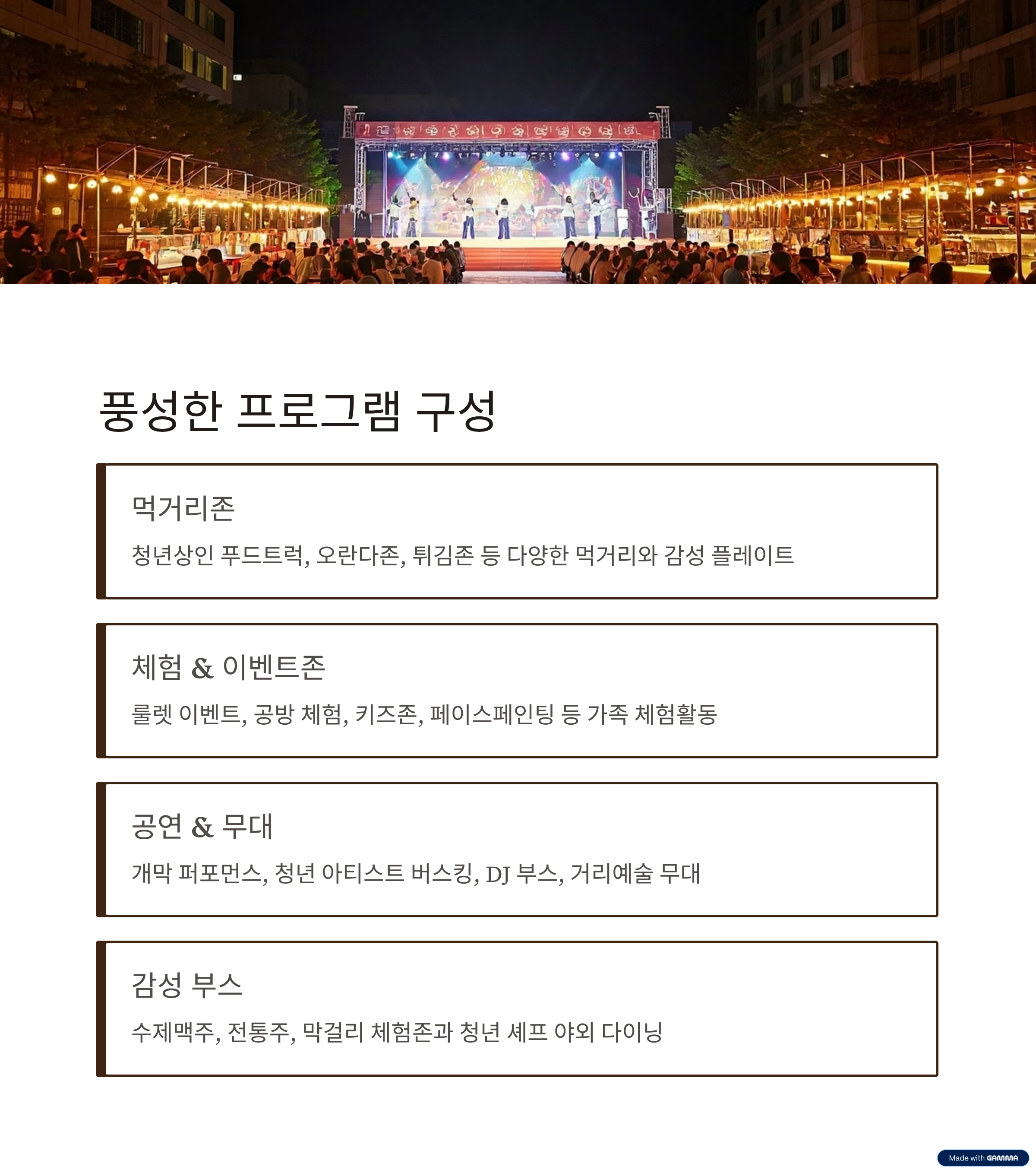 | 공연 & 무대 | 개막 퍼포먼스, 청년 아티스트 버스킹, DJ 부스, 거리예술 무대까지 운영 |