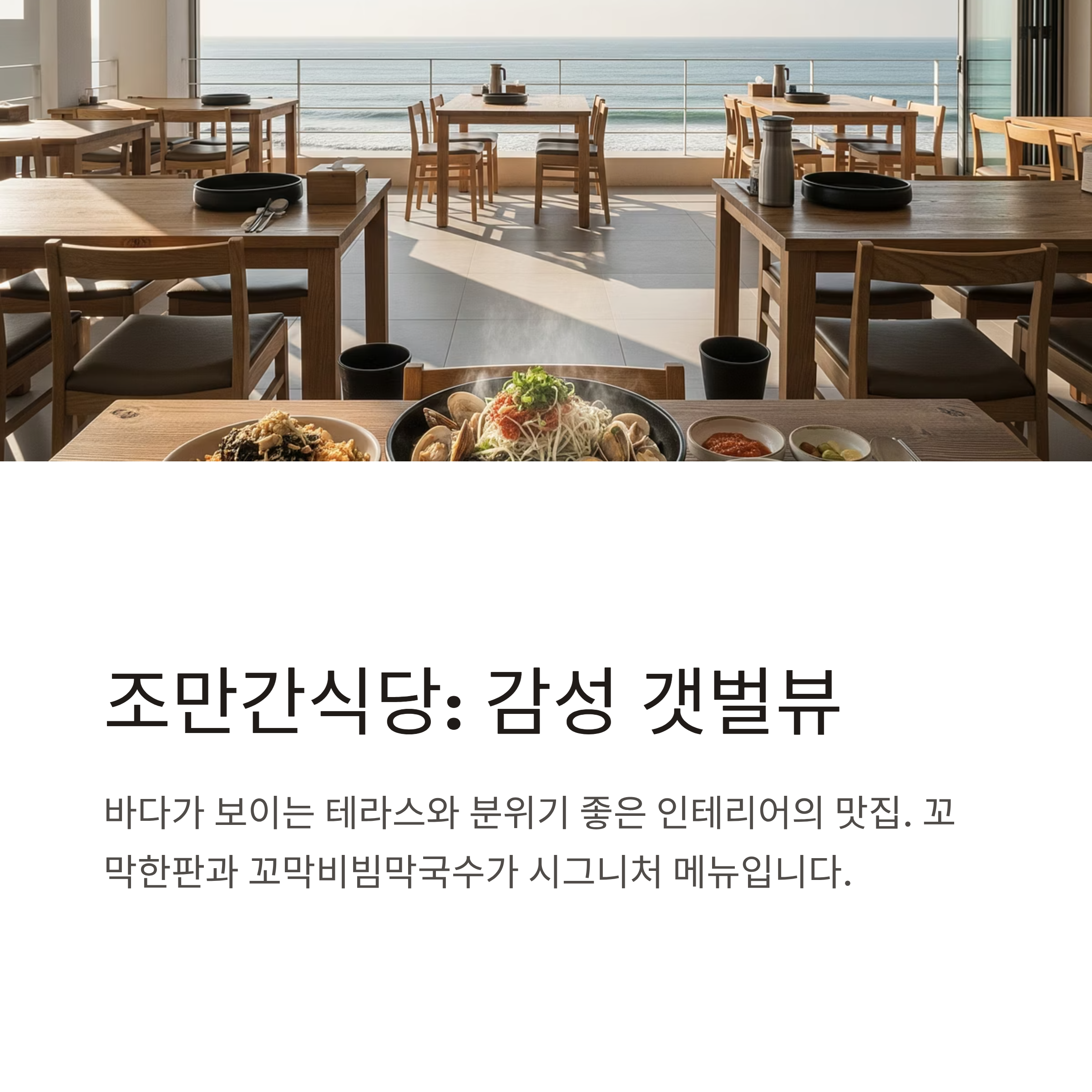 | 조만간식당 | 꼬막한판, 육회한판, 비빔막국수 | 13,000 ~ 39,000원 | 감성 인테리어, 바다뷰 테라스, 데이트 장소로 인기 |
