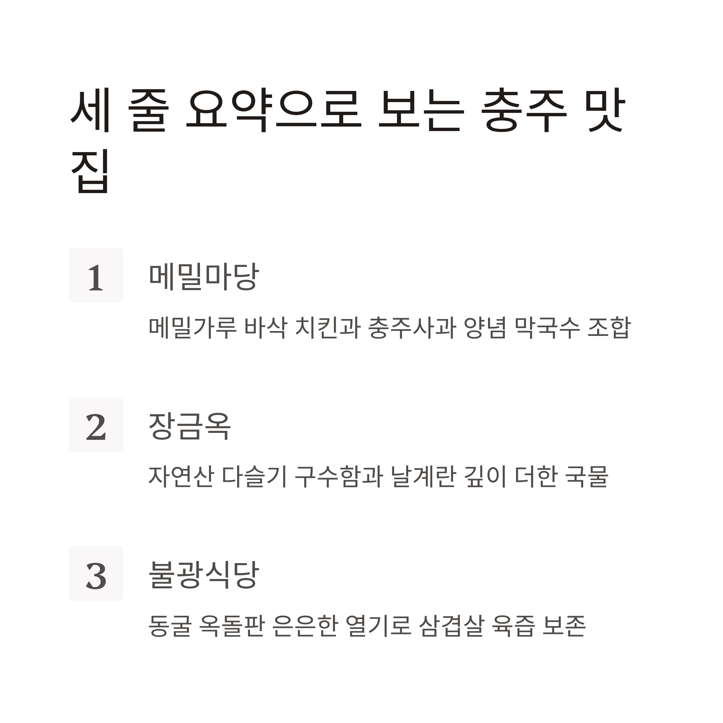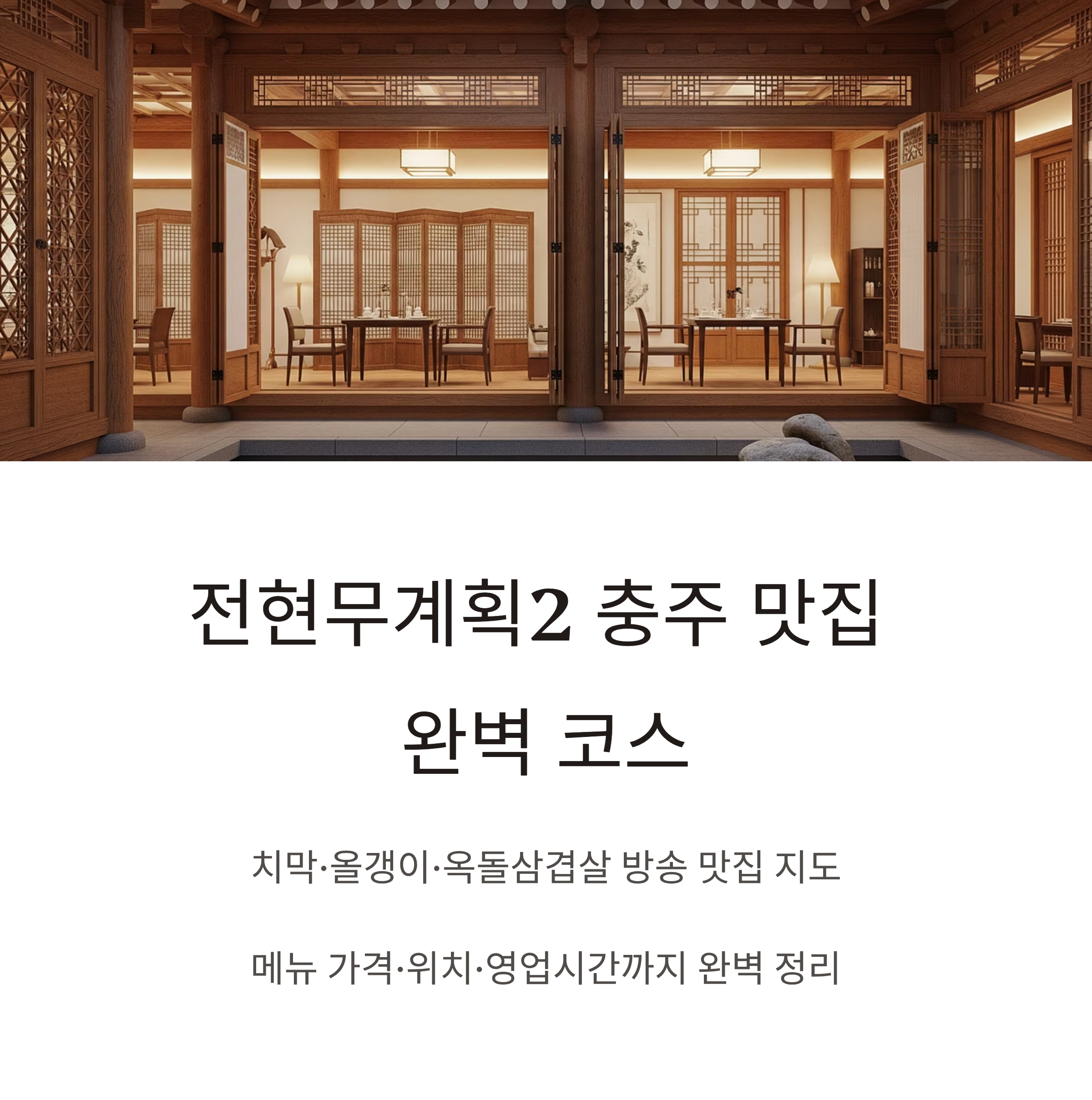 전현무계획2 충주 편에 소개된 세 곳만 정리했습니다. 메밀치킨과 막국수의 조합 치막으로 유명한 메밀마당 중앙탑본점, 깔끔한 국물의 올갱이해장국 장금옥, 그리고 옥돌판에 구워 먹는 노포 감성 불광식당까지. 인기 메뉴와 정확한 가격, 위치와 영업시간, 방문자 평가 포인트를 한 번에 확인하실 수 있도록 구성했습니다.