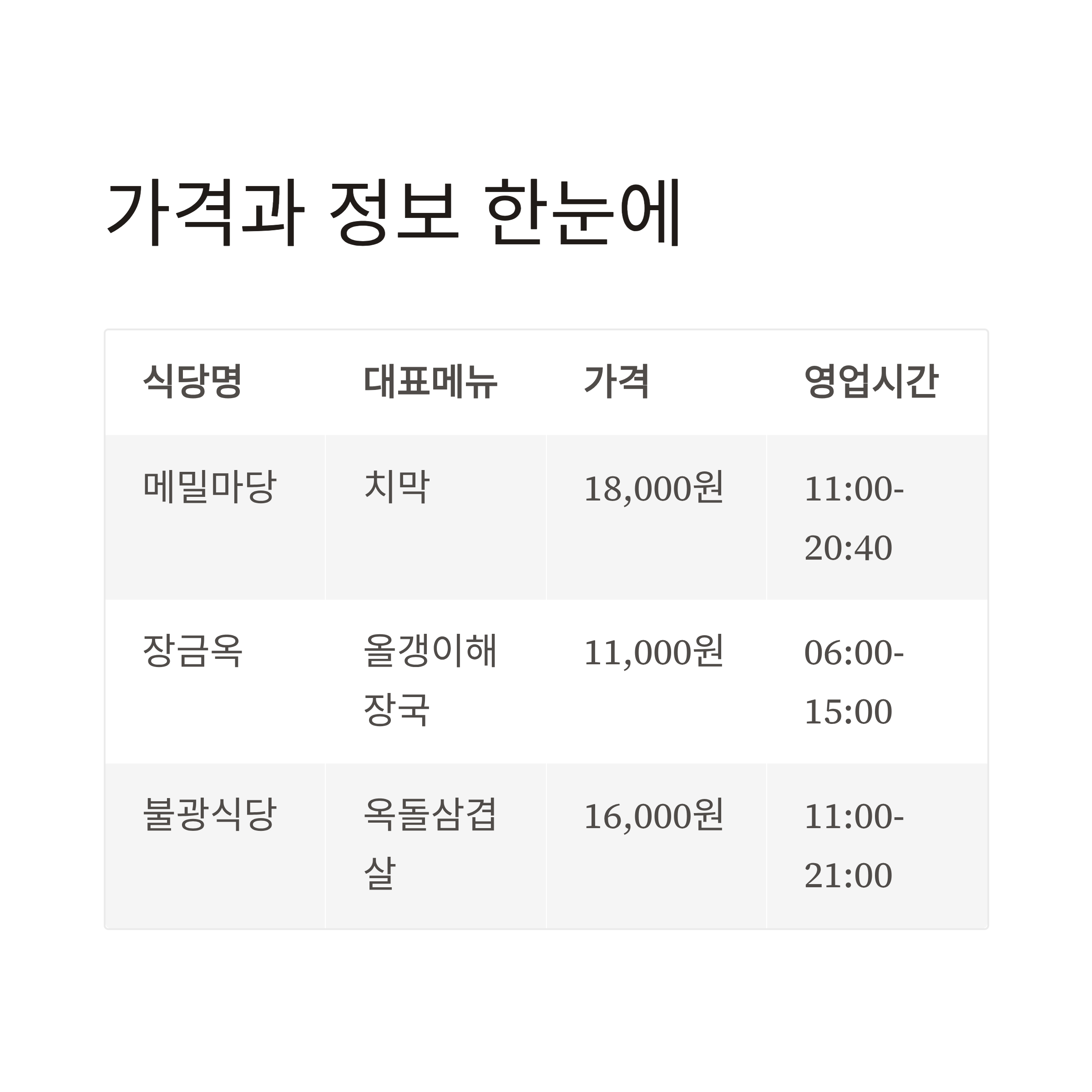 식당명 대표메뉴 가격 영업시간 위치