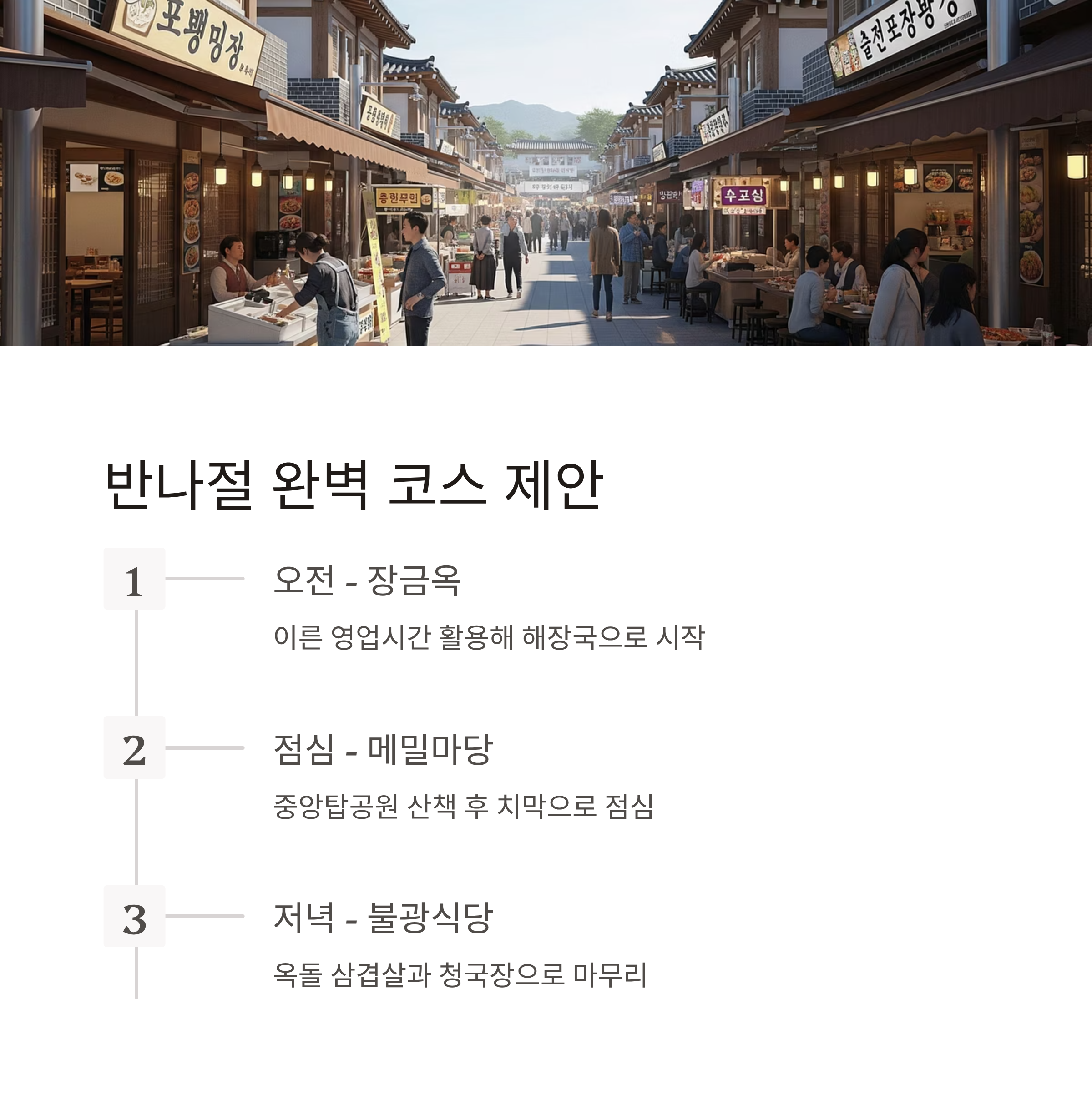 주말과 공휴일에는 세 곳 모두 웨이팅이 잦습니다. 메밀마당은 면 추가와 셀프바 활용으로 대기 시간 대비 만족도를 높이기 좋고, 장금옥은 마감이 빠르니 점심 이전 방문이 안전합니다. 불광식당은 브레이크타임이 명확하니 도착 시간을 조절해 주세요. 인원 수에 맞춰 기본 구성만 주문하고, 테이블 상황에 따라 추가 주문으로 템포를 조절하면 음식 컨디션을 가장 좋은 타이밍에 즐길 수 있습니다.