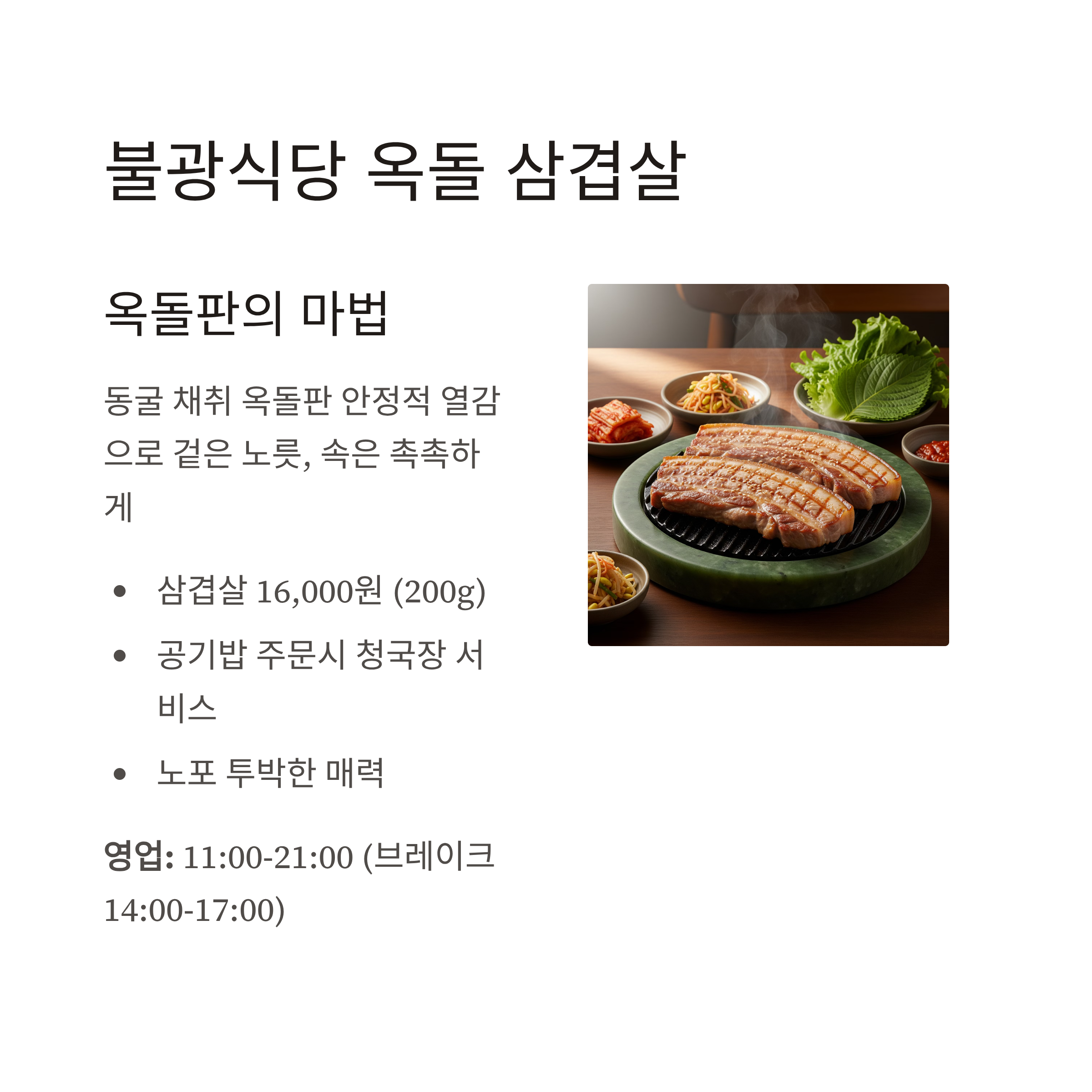 불광식당 옥돌 삼겹살, 청국장 삼겹살 16,000원(200g) 11:00–21:00, 브레이크 14:00–17:00, 월 휴무 성터5길 48, 충주시