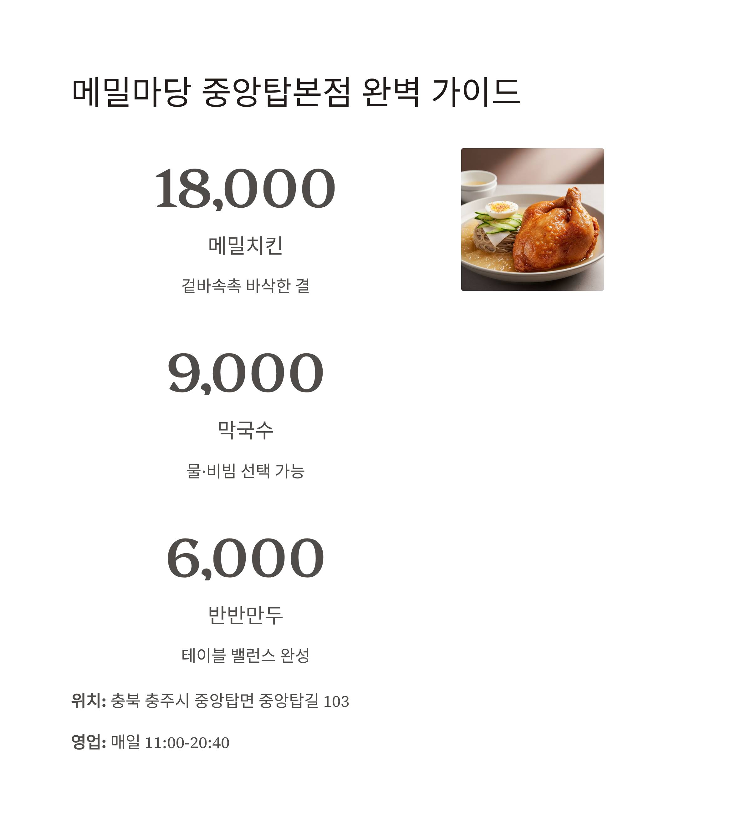 | 메밀마당 중앙탑본점 | 메밀치킨, 물·비빔막국수, 반반만두 | 메밀치킨 18,000원, 막국수 9,000원, 반반만두 6,000원 | 매일 11:00–20:40 | 중앙탑길 103, 충주시 |