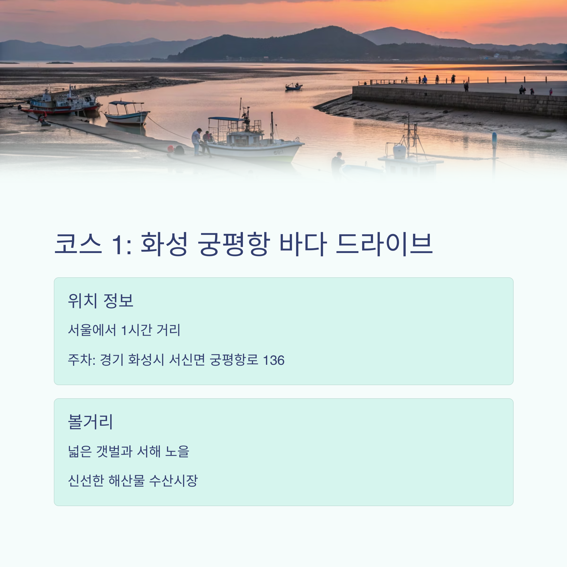 첫 번째 추천지는 화성 궁평항입니다. 이곳은 서울에서 약 75km 떨어져 있어 차로 약 1시간 10분이면 도착할 수 있는 곳인데요.