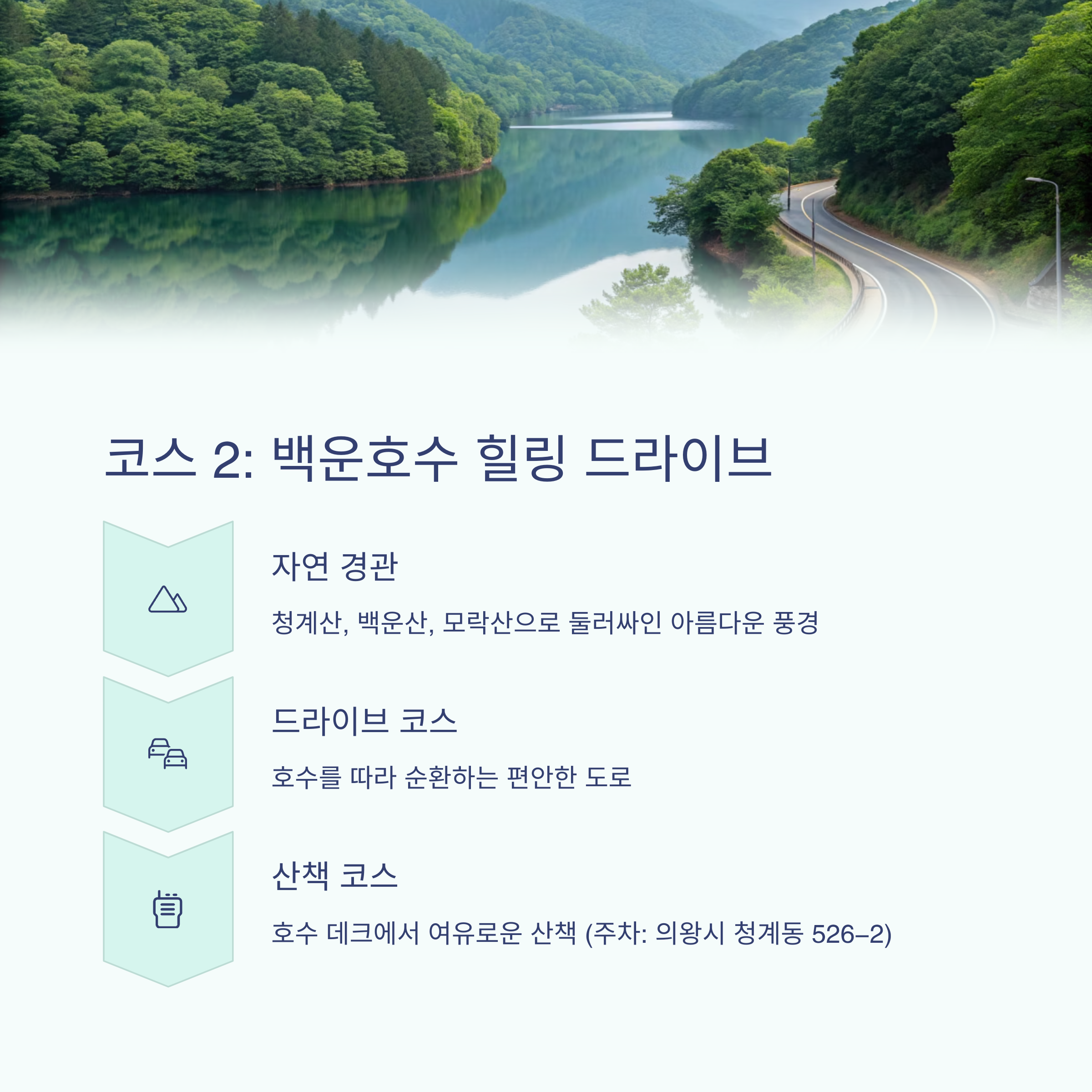 두 번째 코스는 경기도 의왕시에 위치한 백운호수입니다. 서울에서 25~35km 정도 거리로, 40분 내외면 접근 가능한 곳이죠.