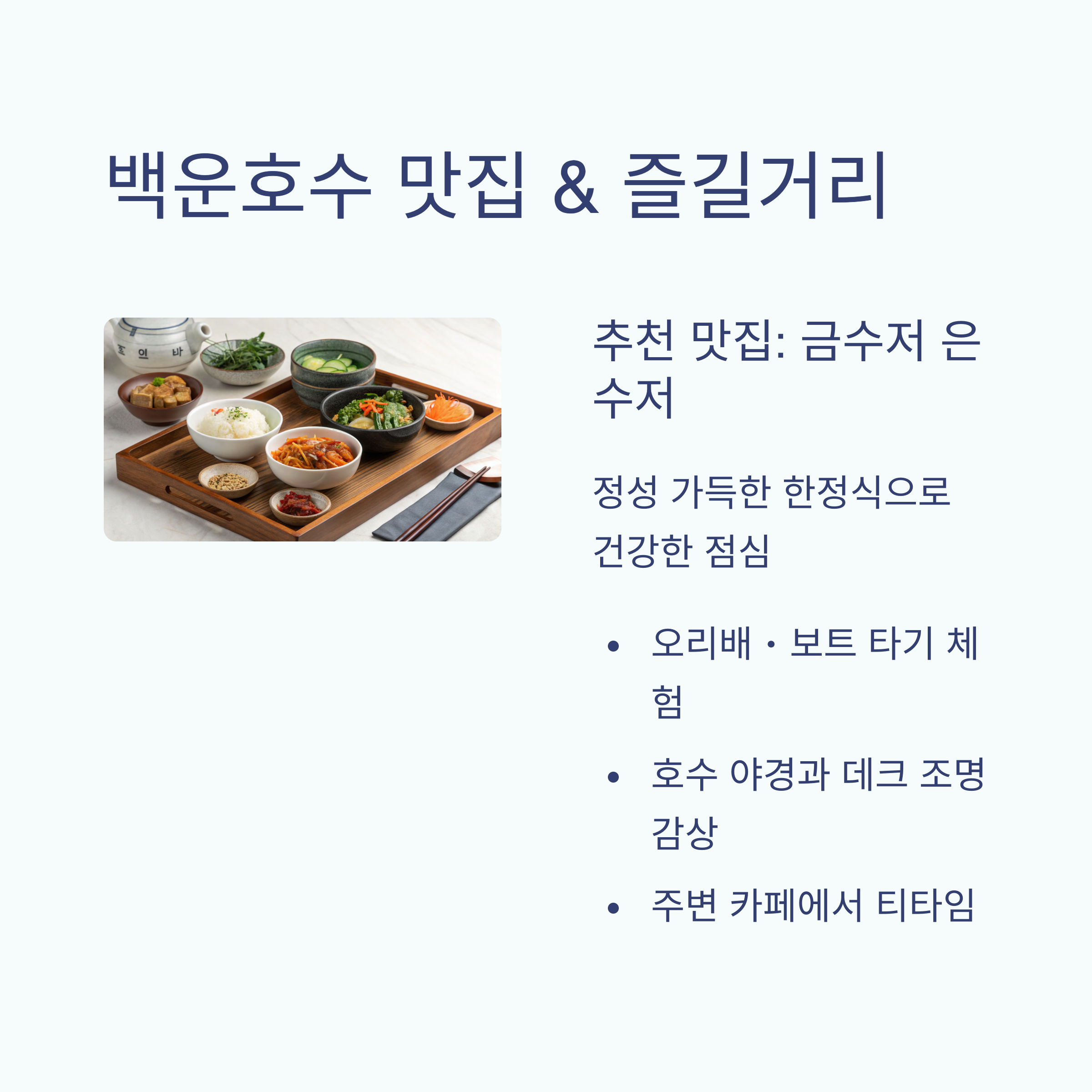 | 백운호수 | 약 2시간 | 산책, 커피 | 디저트 |