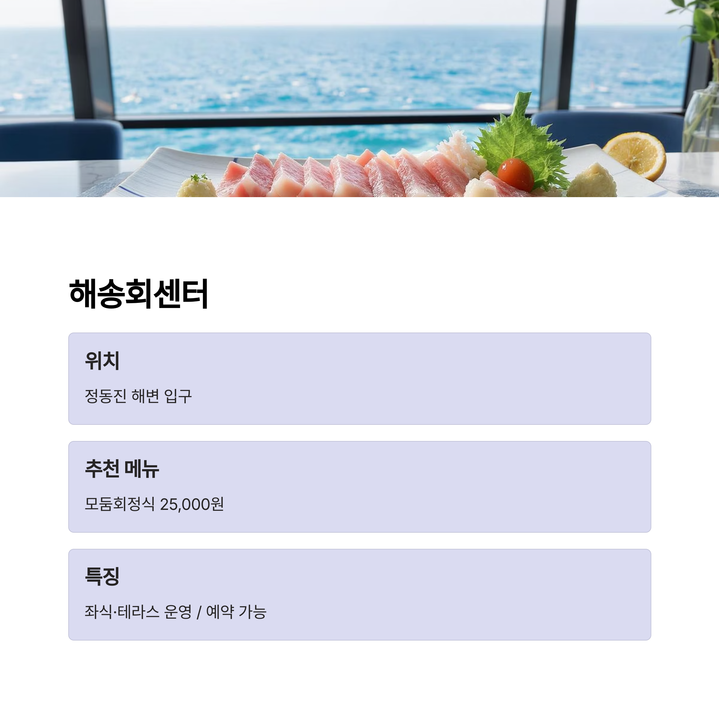 2. 해송회센터 — 바닷가 전망 회정식